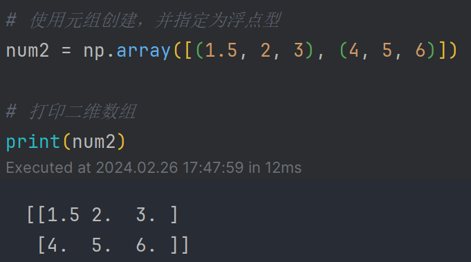 通过将元组传递给np.array()函数,可以直接创建二维数组。如果元组中包含浮点数,则数组的数据类型会自动适应为浮点型,这对于需要进行浮点数计算的场景非常有用。