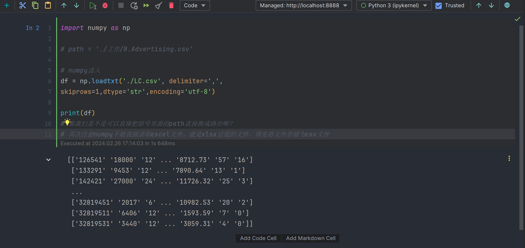 np.loadtxt可能会消耗大量内存。在这种情况下,考虑使用np.genfromtxt,它提供了更灵活的数据加载机制,包括处理缺失值。Excel文件: 正如笔记中提到的,NumPy不能直接读取Excel(