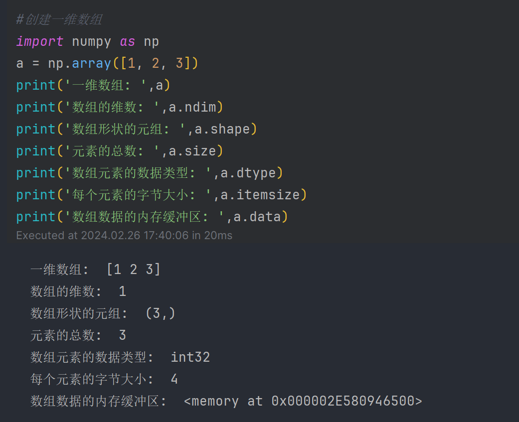 a.ndim:显示数组的维数。对于一维数组,此属性值为1。a.shape:返回一个表示数组形状的元组,对于一维数组,形状会显示为(n,),其中n是数组中元素的数量。a.size:表示数组中元素的总数。a.dtype:显示数组元素的数据类型,例如int64。a.itemsize:数组中每个元素的字节大小。a.data:指向数组数据的内存缓冲区。