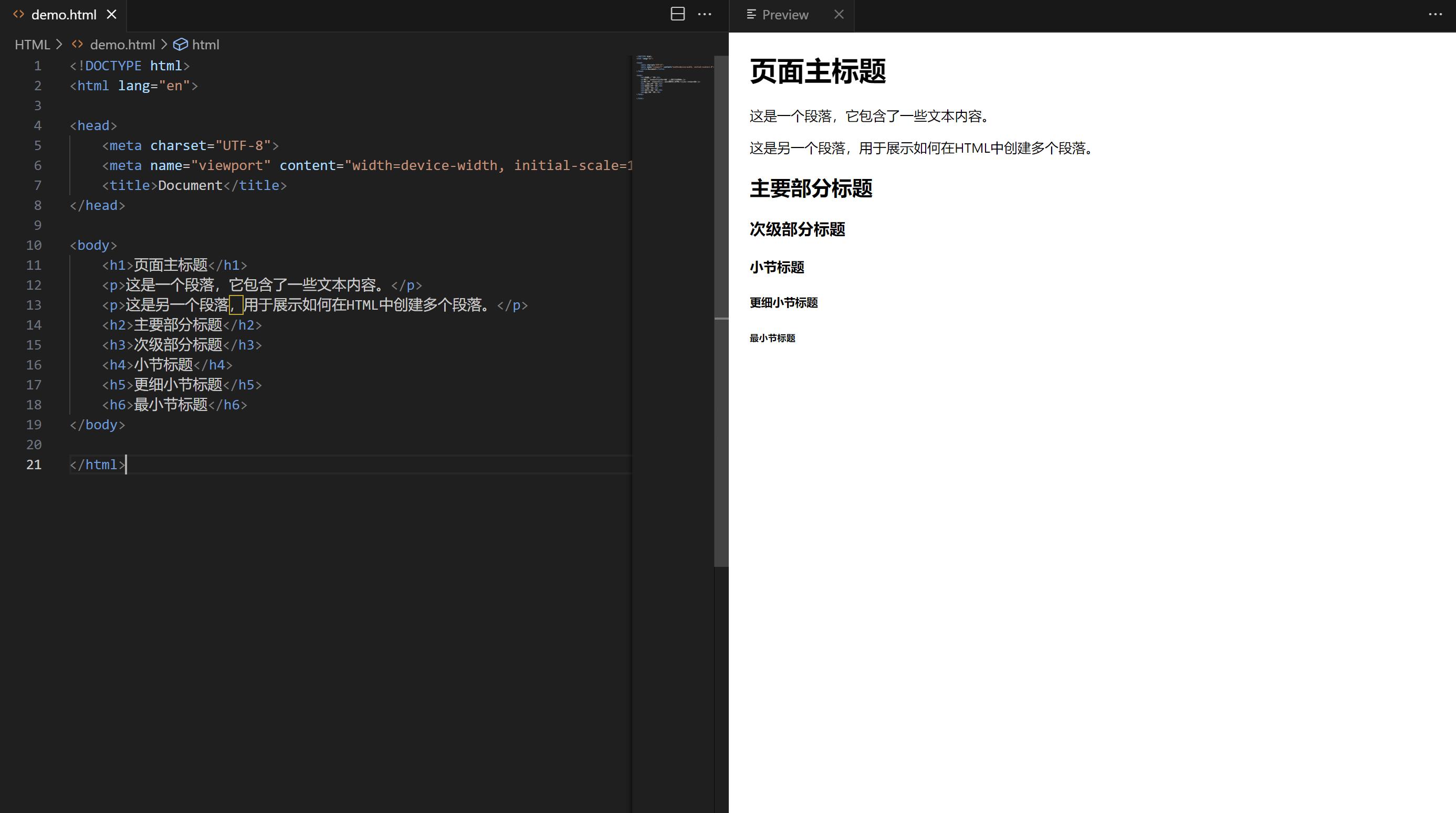 HTML中的标题标签用于定义文档的标题和子标题,有六级,从<h1>到<h6>。这些标签不仅用于视觉上区分不同层次的标题和子标题,而且对于搜索引擎优化(SEO)也非常重要,因为搜索引擎利用这些标签来理解页面的结构和内容的重点。