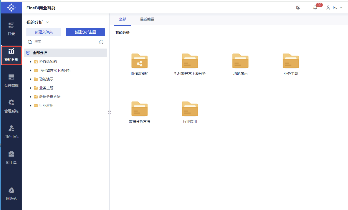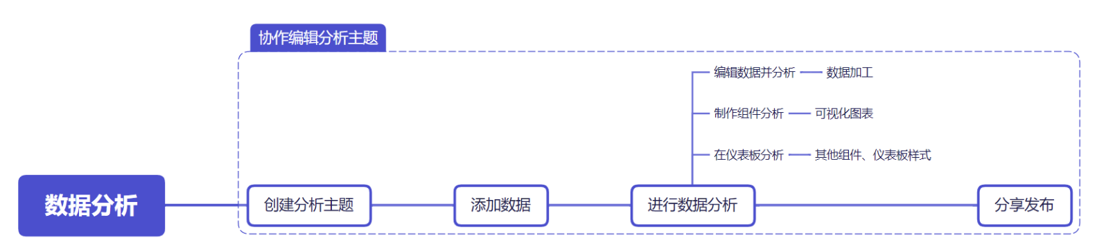 【我的分析】是在BI中进行分析的容器,是我们学习的重点,所有的分析操作都是在【分析主题】中进行。同时【分析主题】支持不同用户之间进行协作编辑,极大的方便了用户对分析内容的共享。