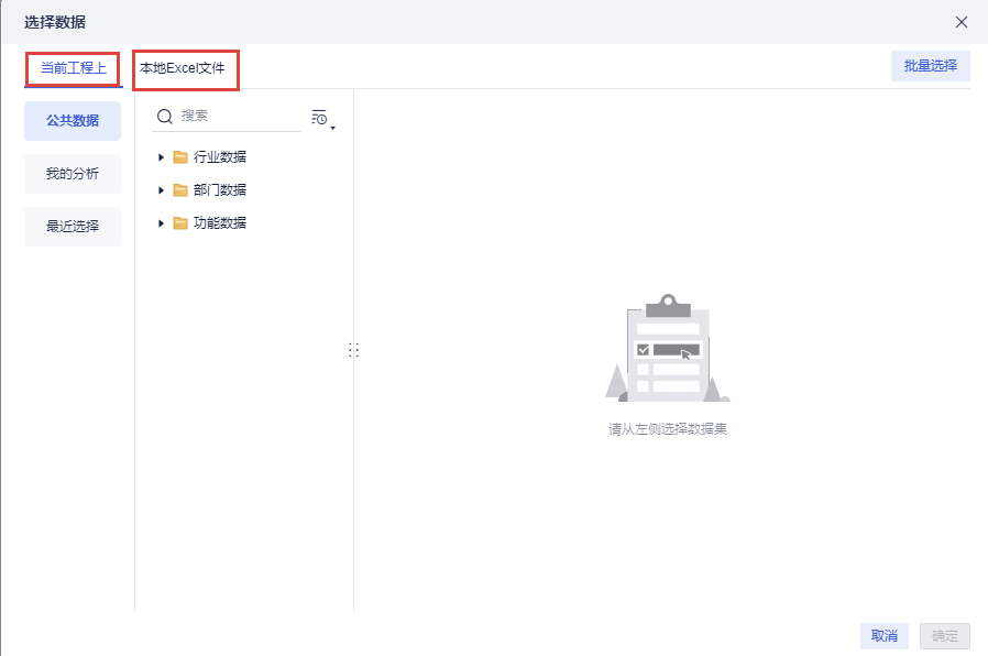 - 方式一:【当前工程上】直接挑选自己需要的已上传到FineBI中的数据,此处的数据在学习时可以自己提前上传一份数据到【公共数据】中