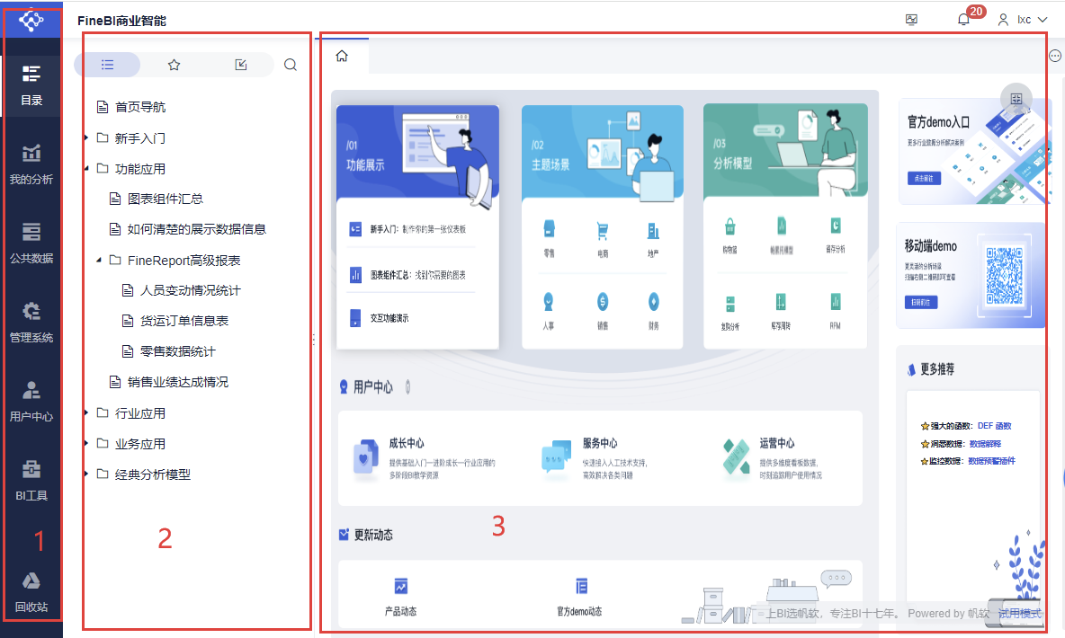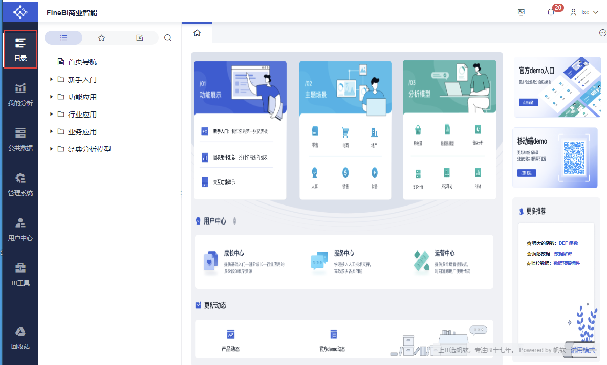 【目录】主要分为目录区域和预览区域,通常的操作是完成分析报告后把分析报告挂载出来的地方,把分析报告挂载到目录上就可以给其他用户分享