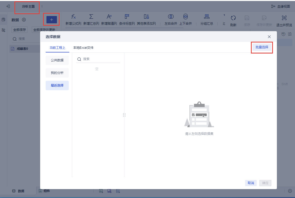 - 方式二:点击【分析主题】界面的【加号】进入【选择数据】的界面,若需要对多张表进行操作,可点击【批量操作】