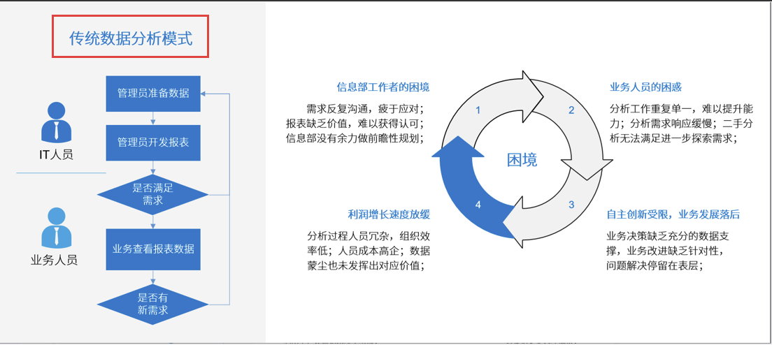 • 传统分析模式:数据准备可能不够充分,沟通成本大,对业务人员的限制大,工作效率低下,成本大