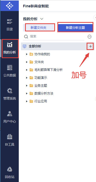 - 方式一:点击【新建文件夹】或者点击【加号】,再到文件夹下添加相关的数据表和创建分析