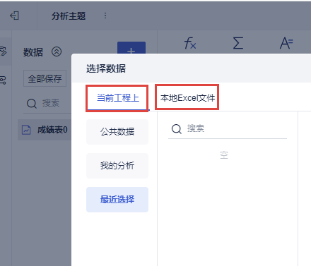 - 新建分析主题后,会自动进入分析主题内的【选择数据】界面