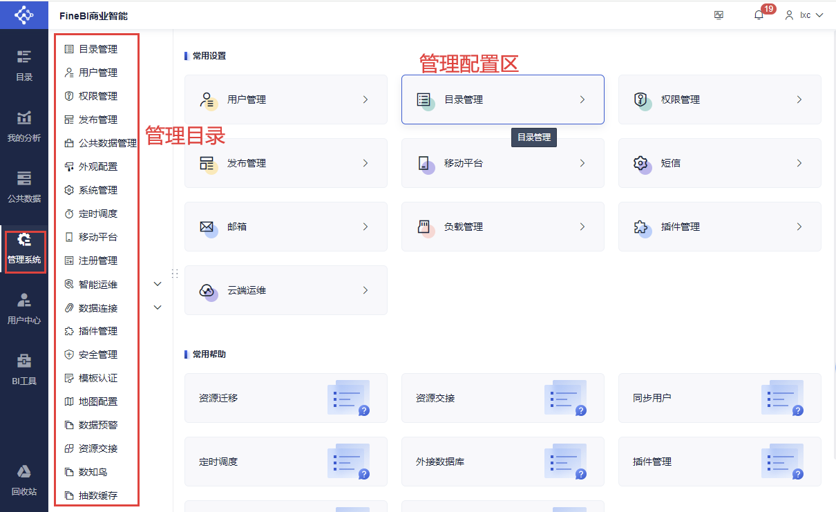 管理系统为管理员进行数据决策系统管理的地方,支持目录、用户、外观、权限等的管理配置