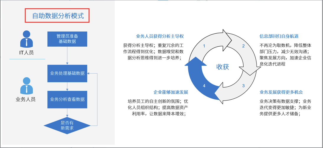 • 自助分析模式: 业务人员能够自主分析,降低沟通成本,效率高