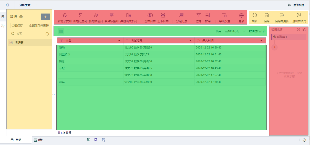 - 红色区域:编辑数据区域对数据进行分析,包括表头分析,以及添加分析步骤,分析历史记录等