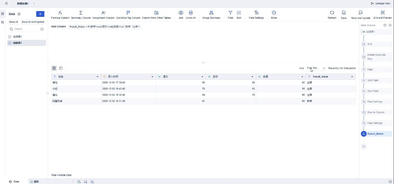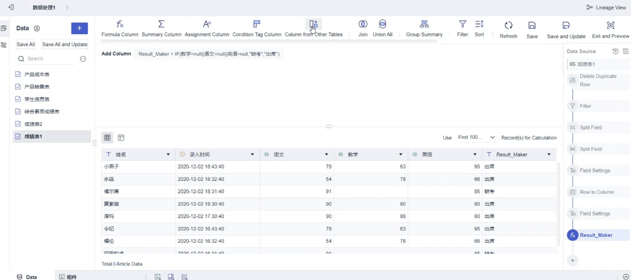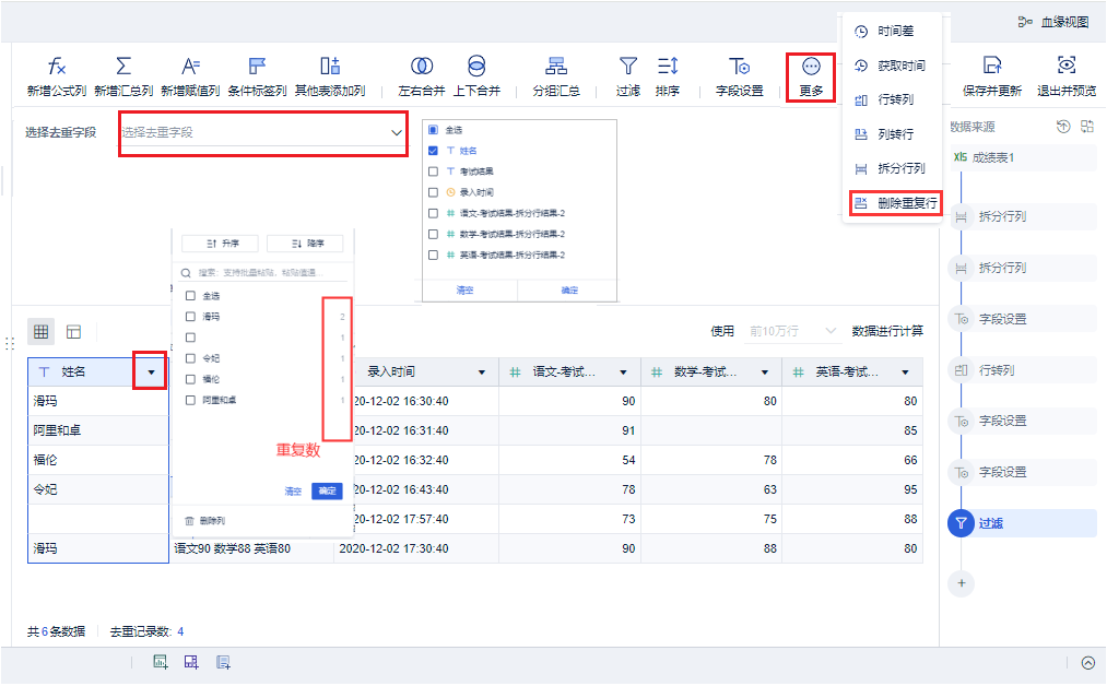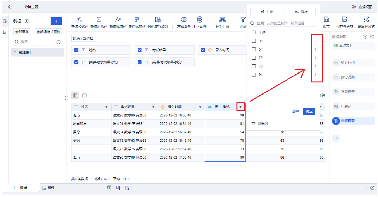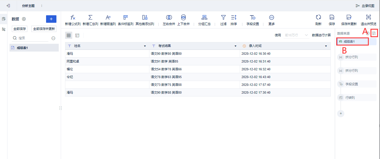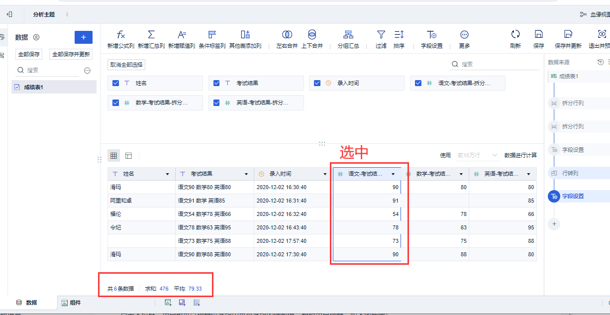 使用拆分行列,行列转换,字段设置对考试结果进行处理