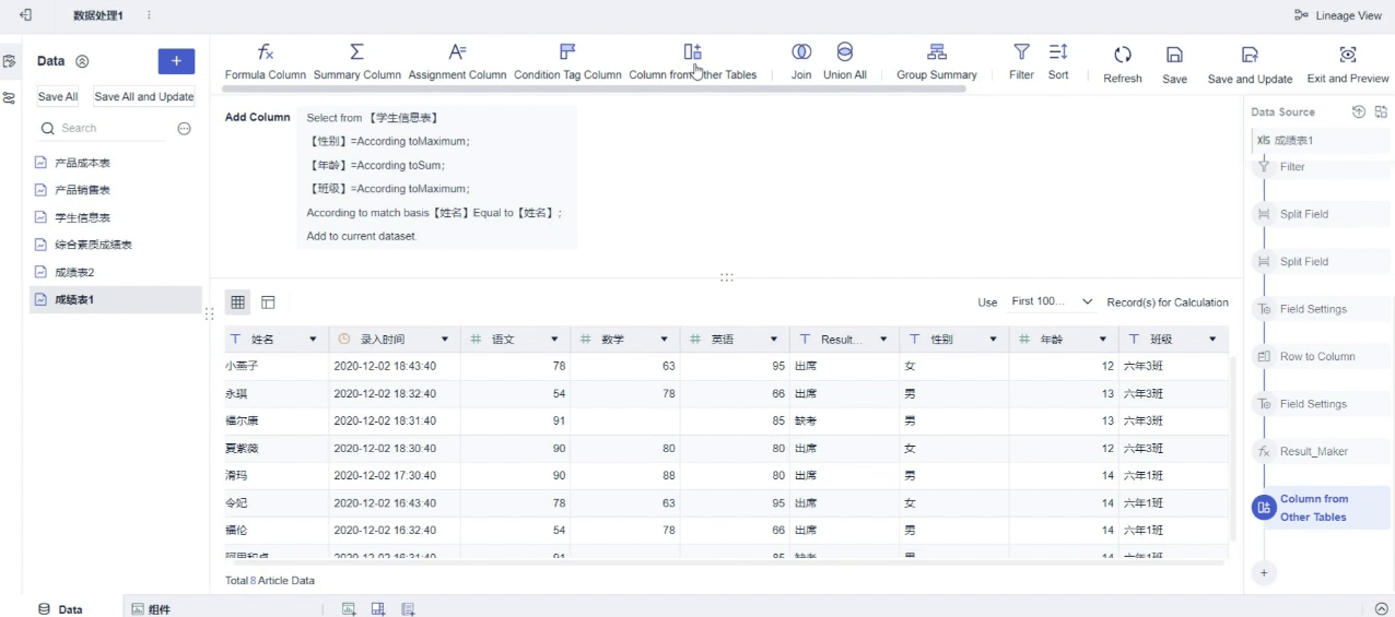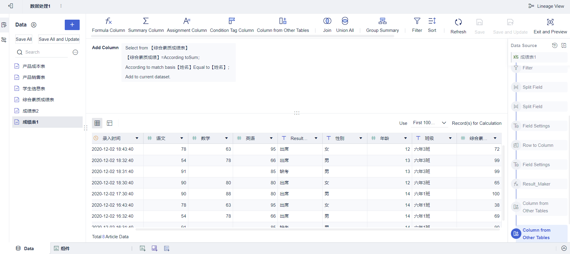 - 使用其它表添加列功能添加总和素质成绩表的求和值