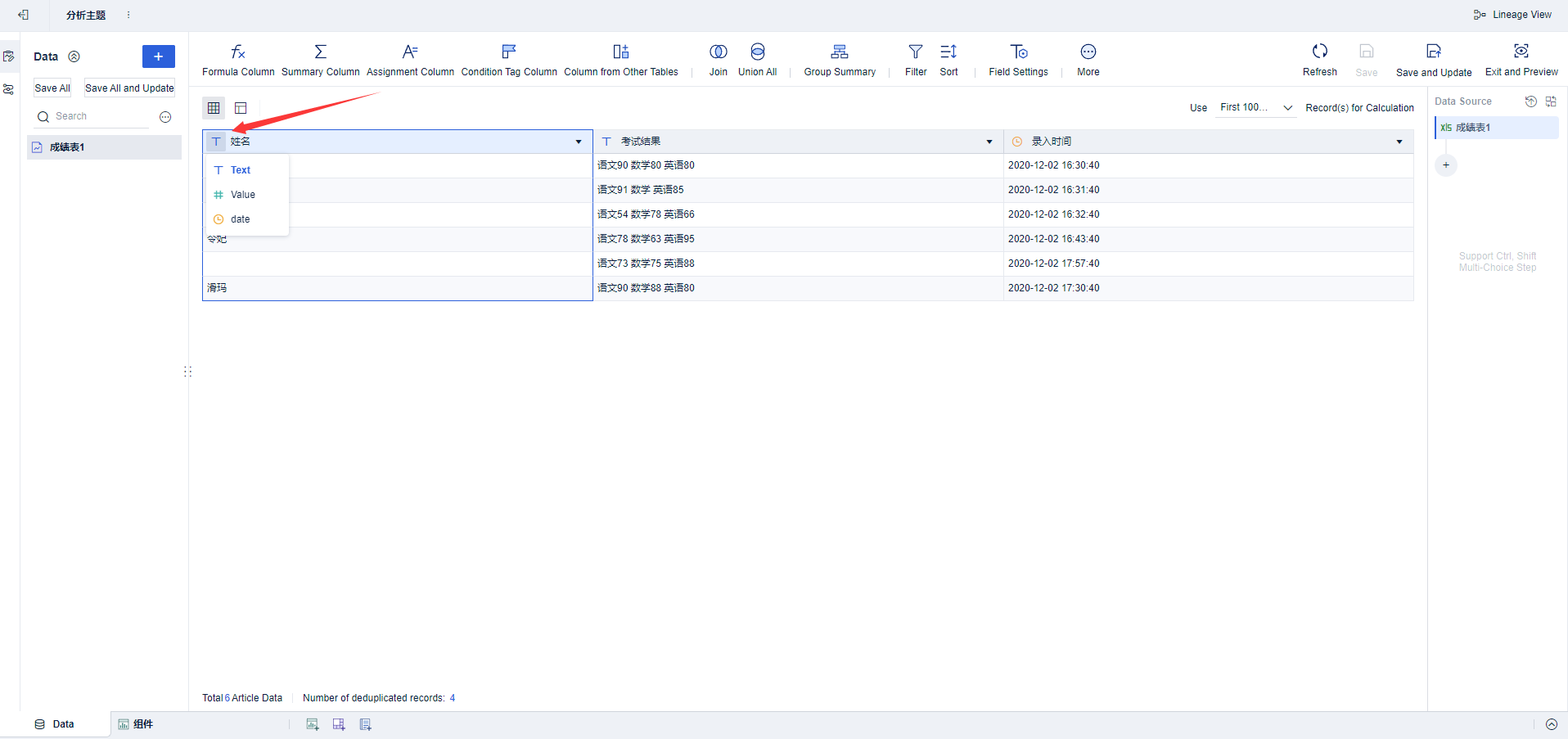 2)点击文本/日期字段,显示该列「去重计数」数值