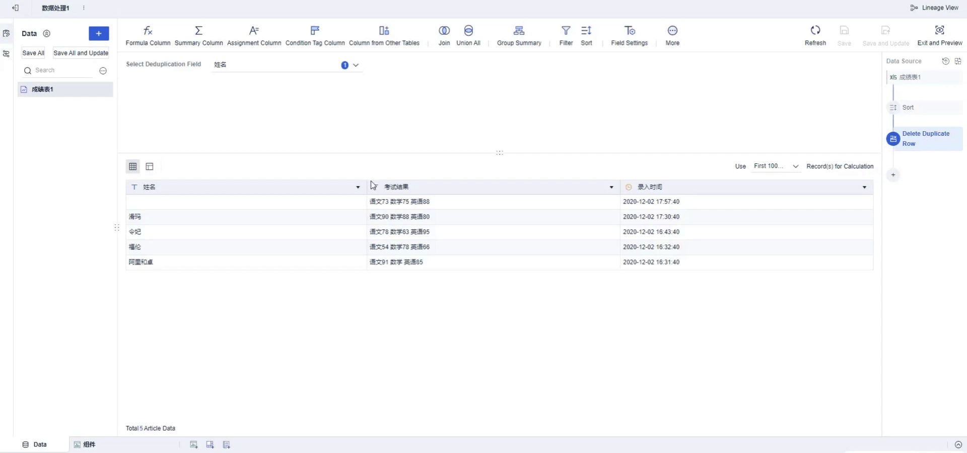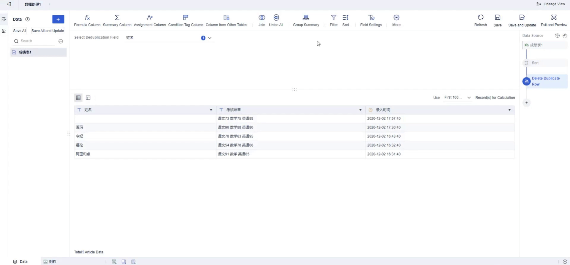 假设同一个人的成绩第一次登记的作废,需要留下第二次输入的,那么可以将时间设置为【降序】,这时先登记的成绩在下,后更新的成绩在上,这样就能保证数据的准确性。