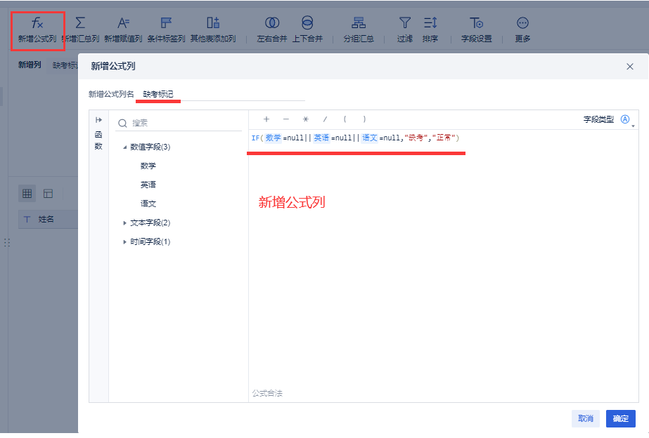 通过新增公式列对于需要保留的空缺列可以添加标识行例如IF(${数学}=null||${语文}=null||${英语}=null,"缺考","出席")