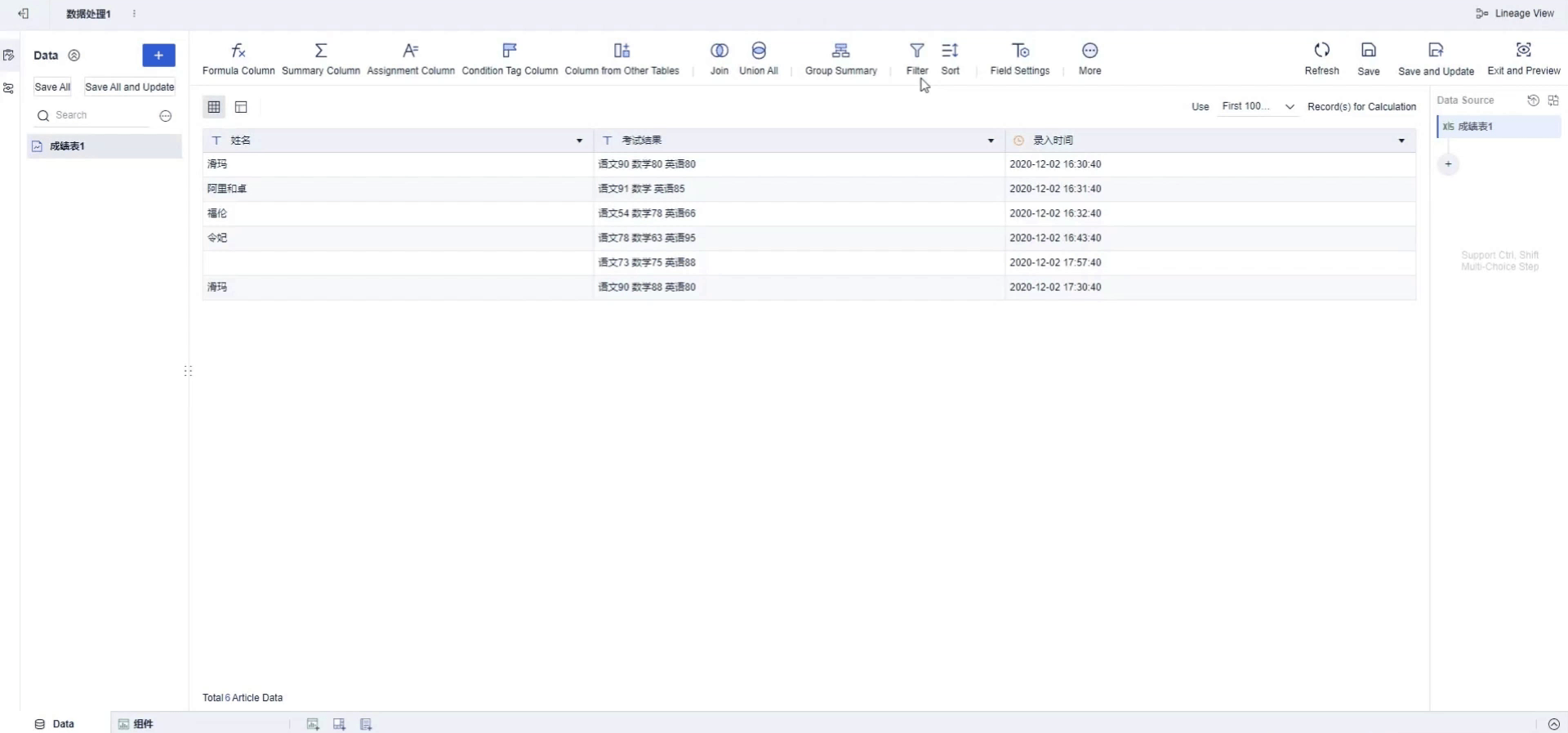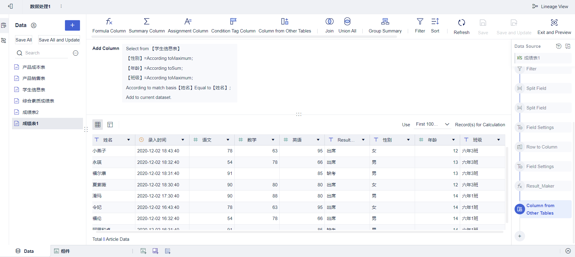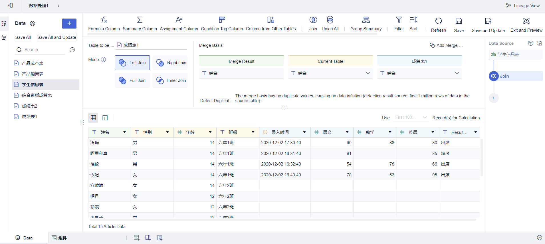 - 在导入成绩表 2 后数据来源选中数据表 1 回溯操作到第一步