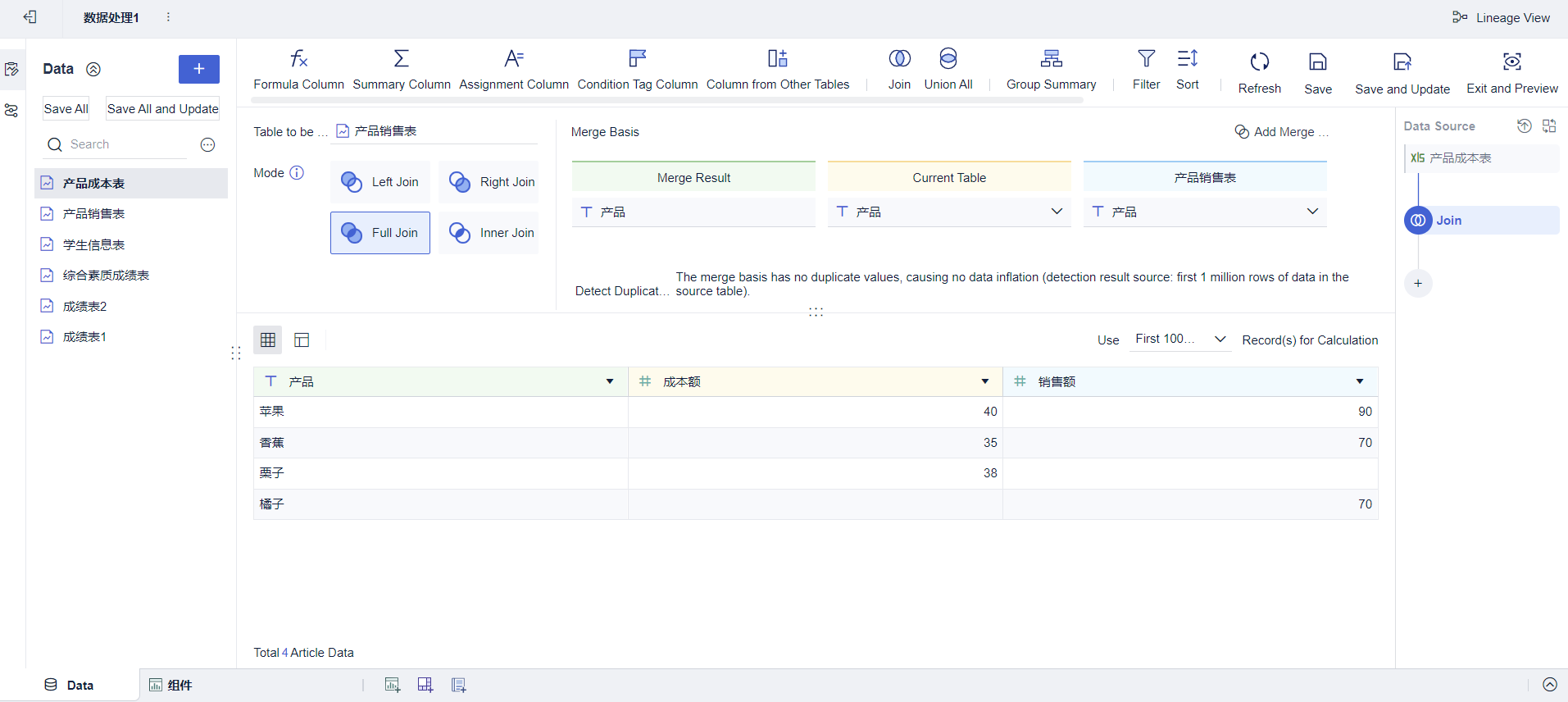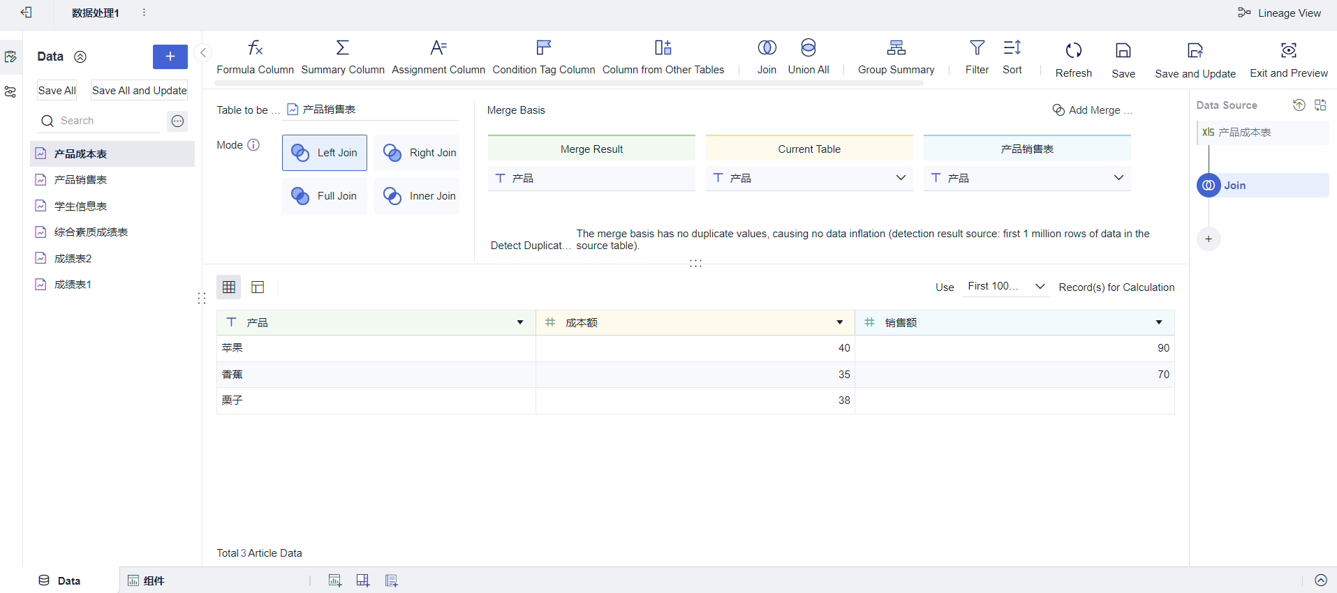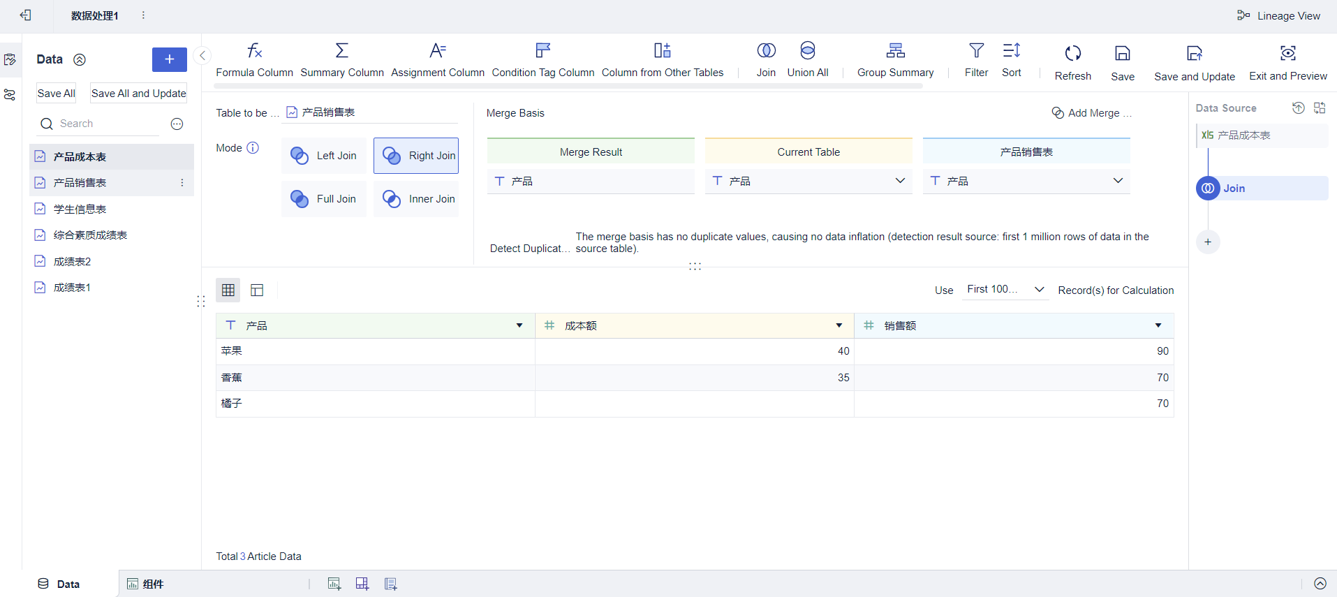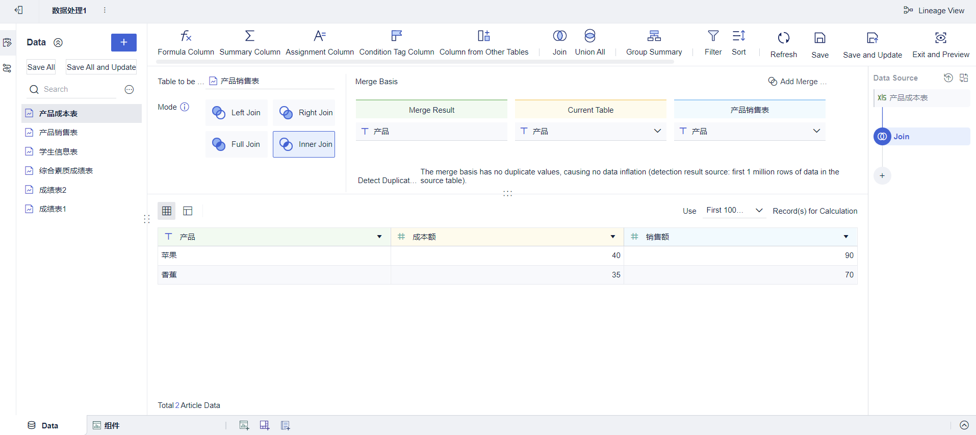 - 以产品成本表为主表,产品列为依据,进行交集合并,则合并产品销售表的所有销售额到产品成本表的最右列。
