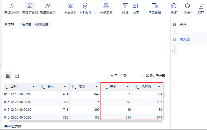例:使用示例数据计算买入-卖出差额后,需要将差额进行绝对值处理。