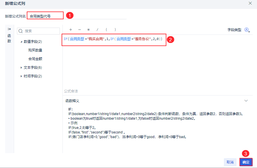 语法设置: if(合同类型="购买合同",1,if(合同类型="服务协议",2,0))