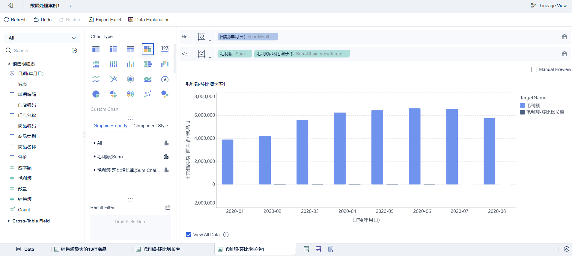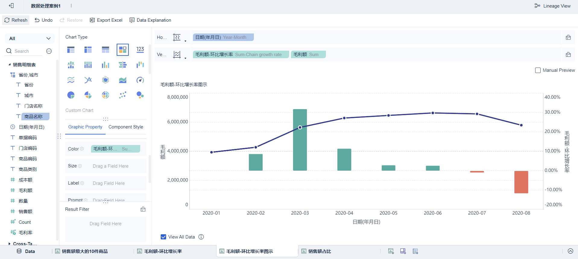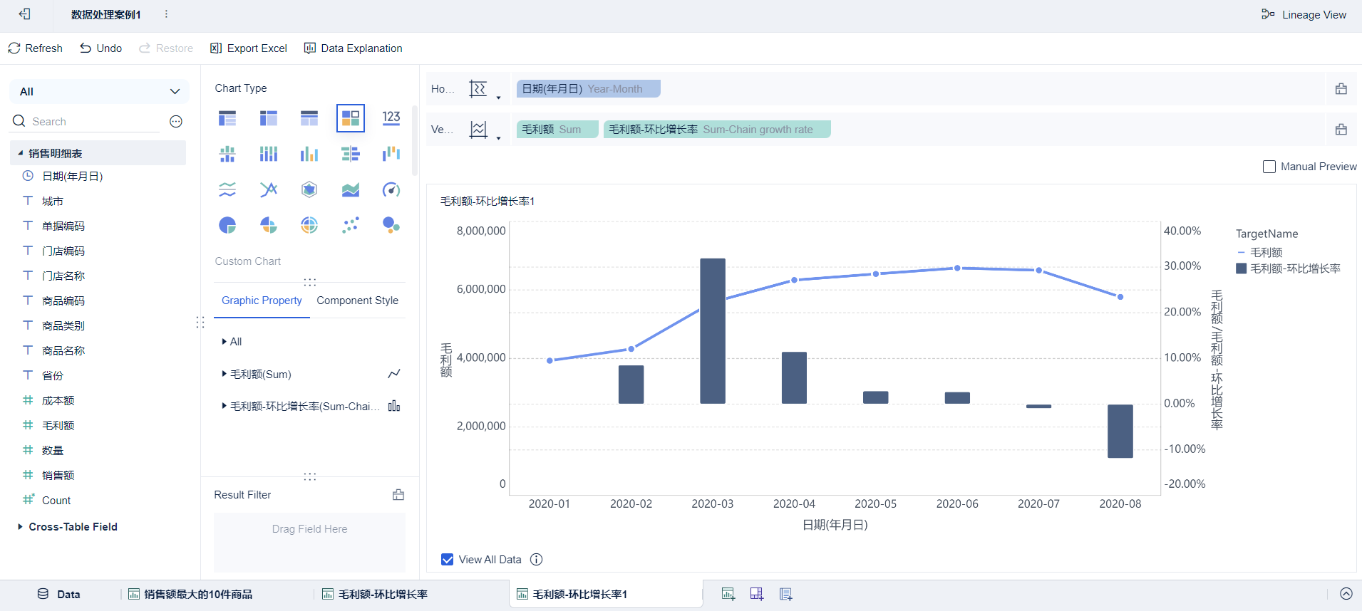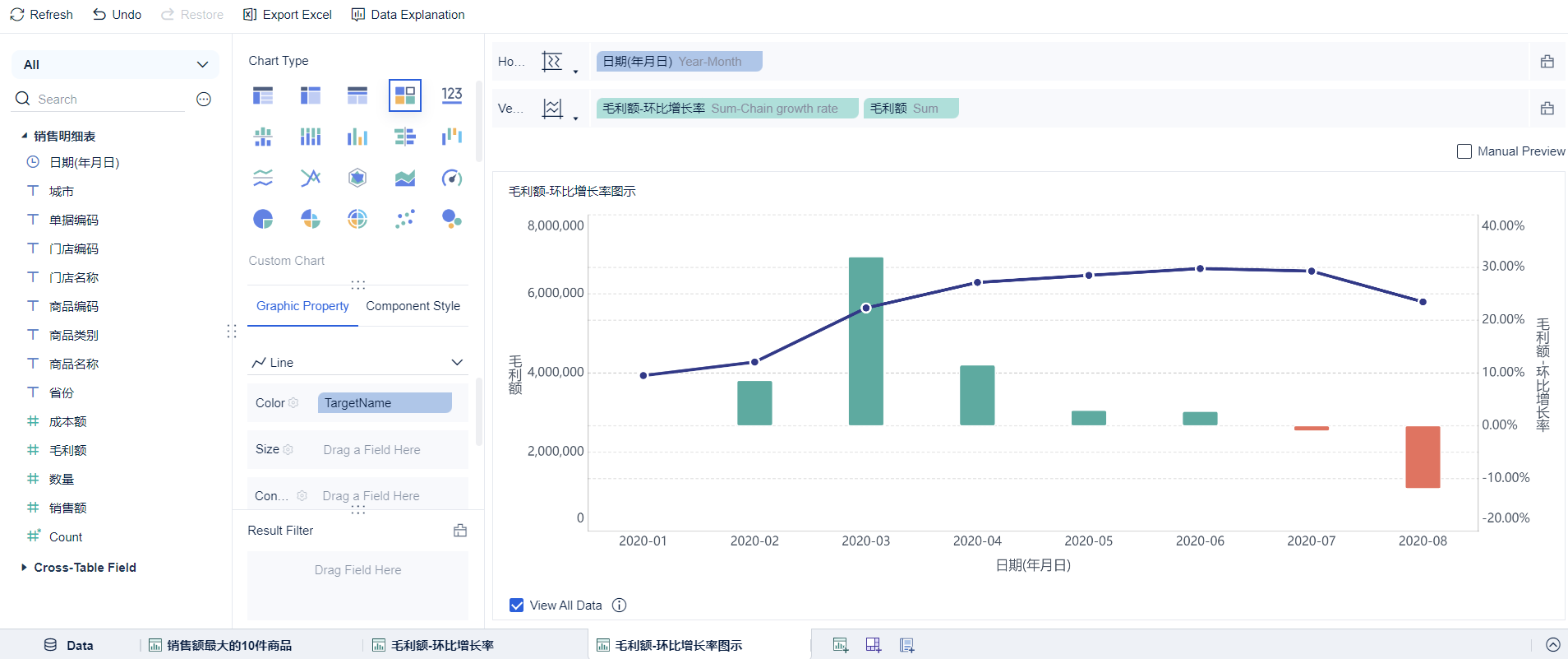 通过修改毛利额为折线图,环比增长率的直轴为右侧对两组数据的可视化进行分割展示