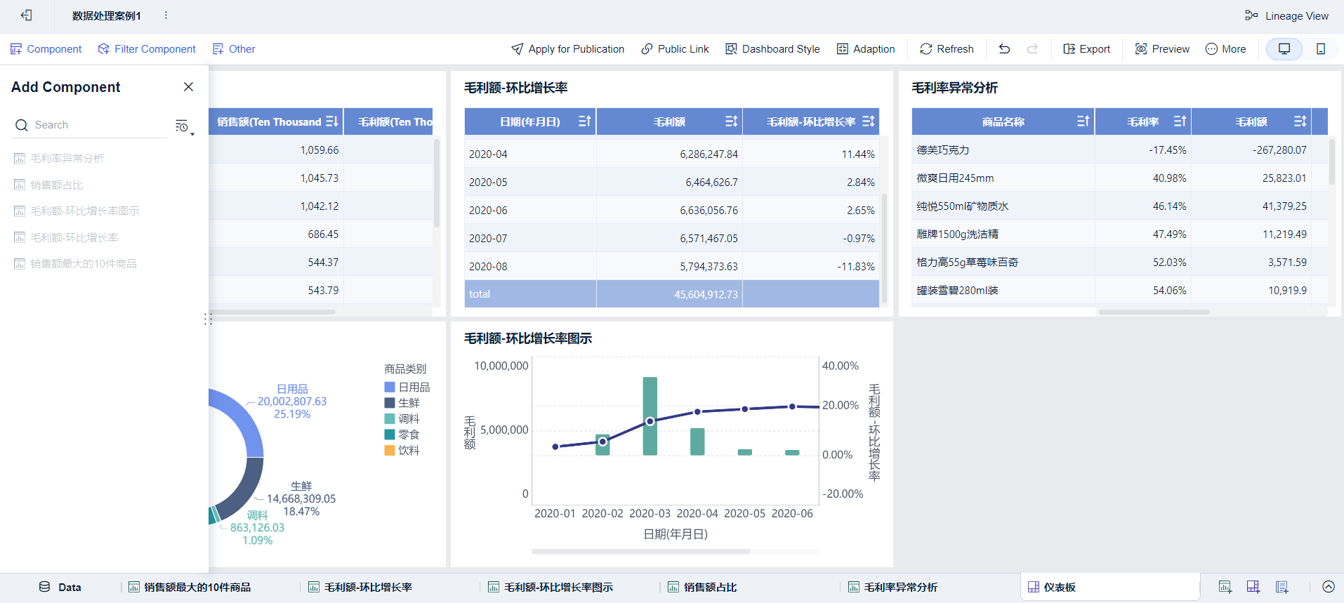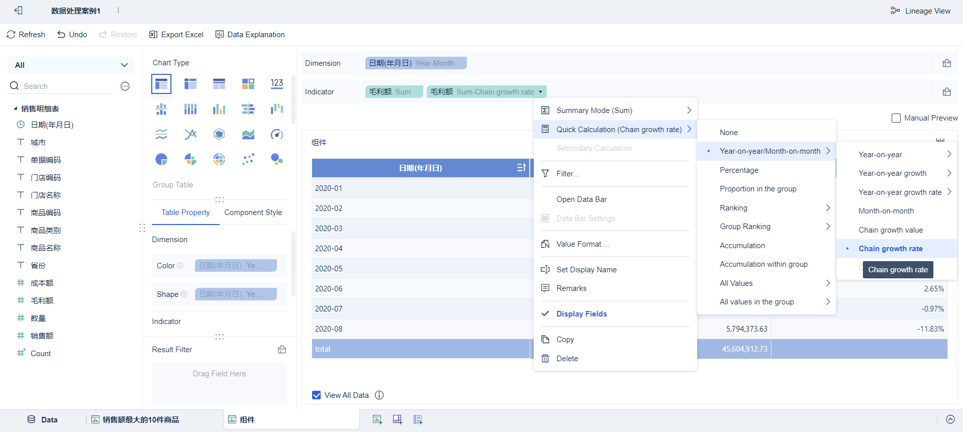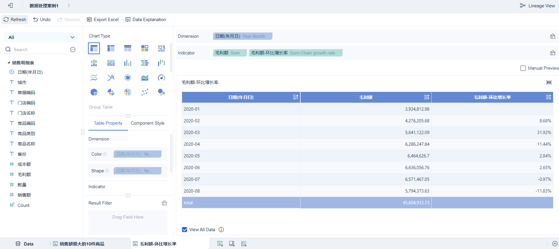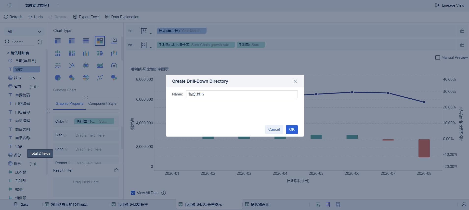 通过修改毛利额为折线图,环比增长率的直轴为右侧对两组数据的可视化进行分割展示