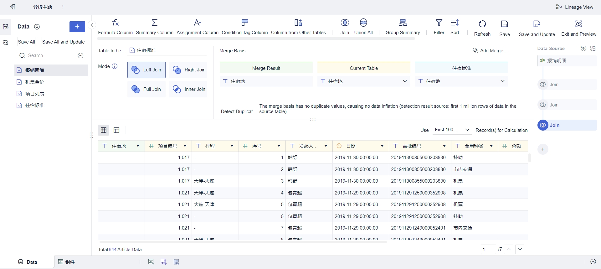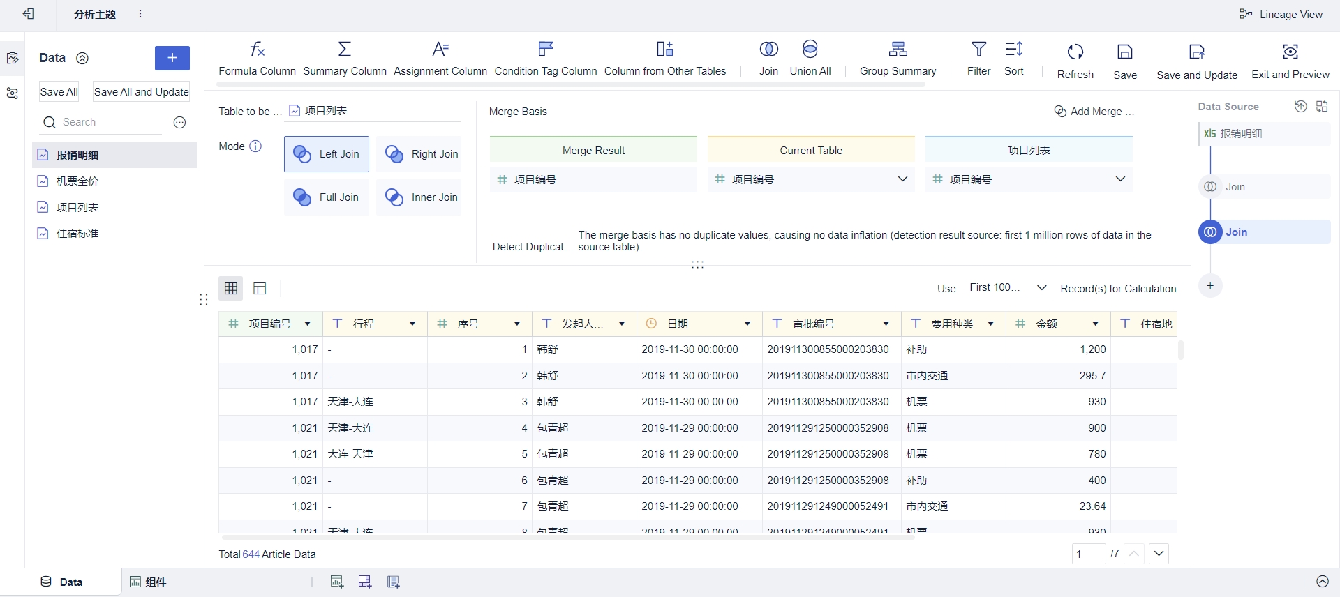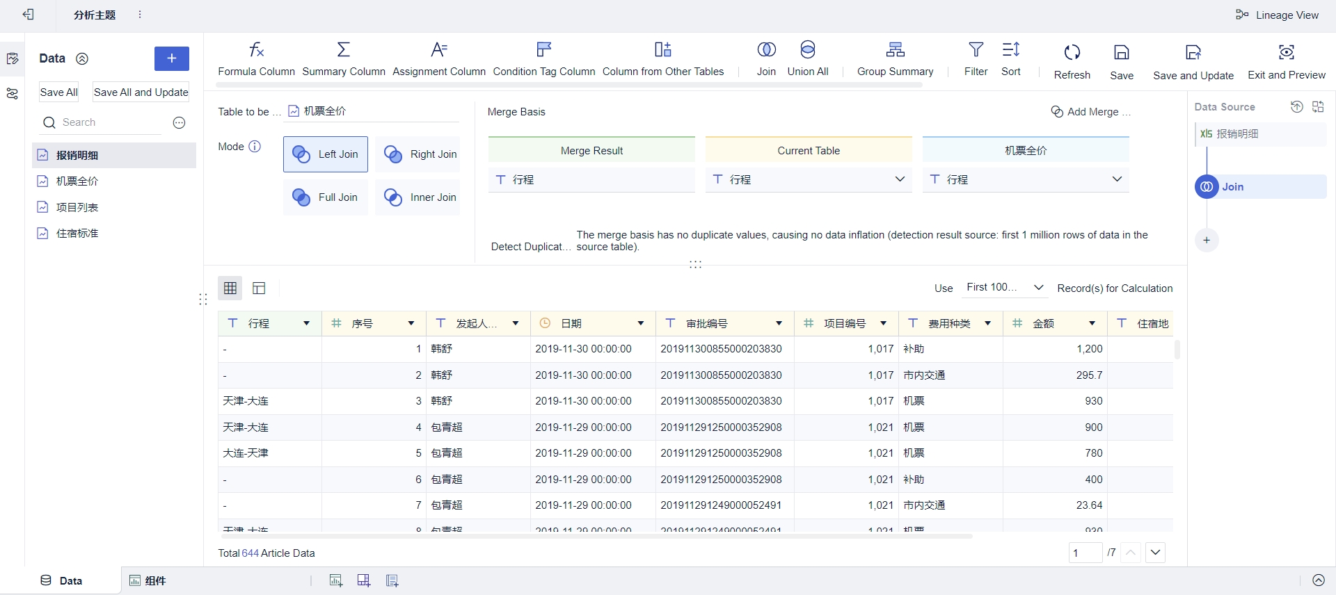 首先根据行程作为主键对表报销明细和机票全价就行左合并