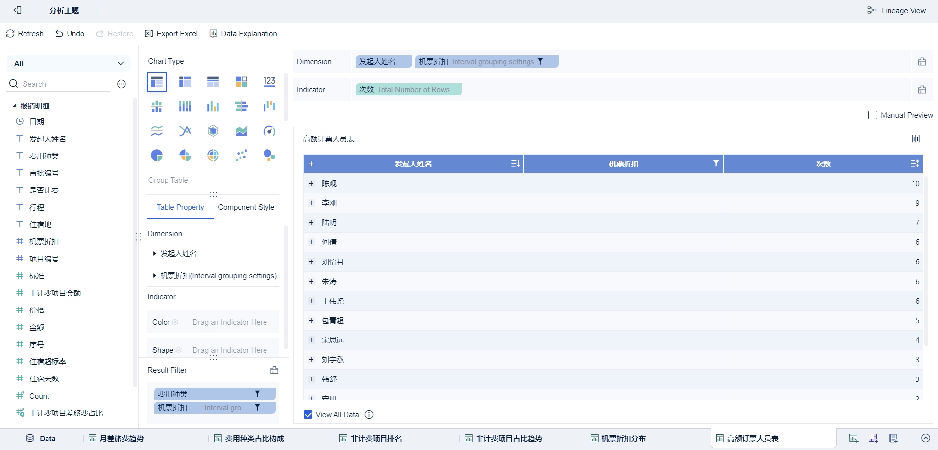 复制之前创建的机票折扣分布,继承其机票折扣的过滤条件,对机票折扣进行二次过滤,只选择8-9折和全价区间。添加发起人姓名作为第二个维度,删除日期。添加组件分组表,对次数进行降序得出高额订票人员排名。