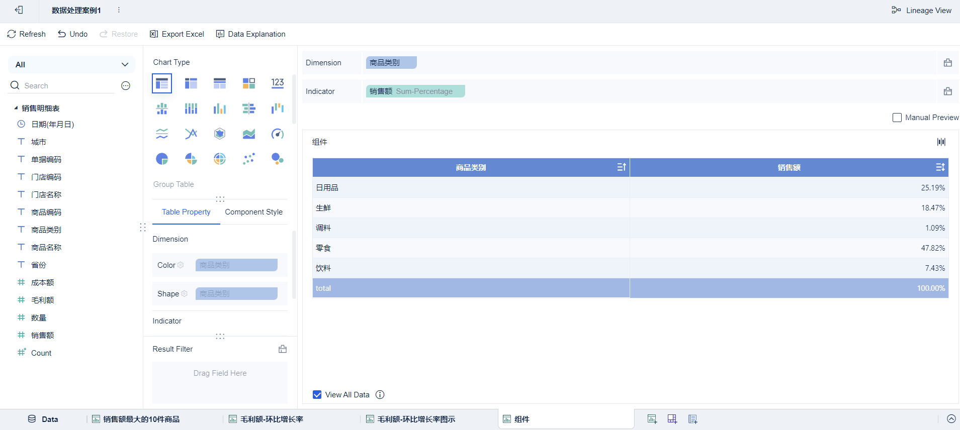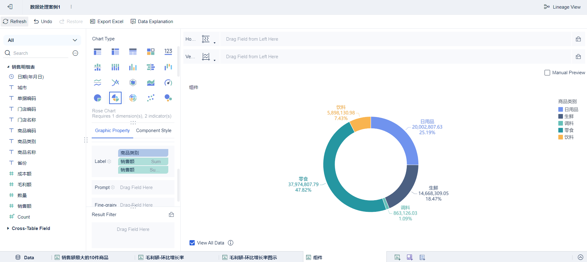 拖动维度商品类别,指标销售额,然后更改指标为占比
