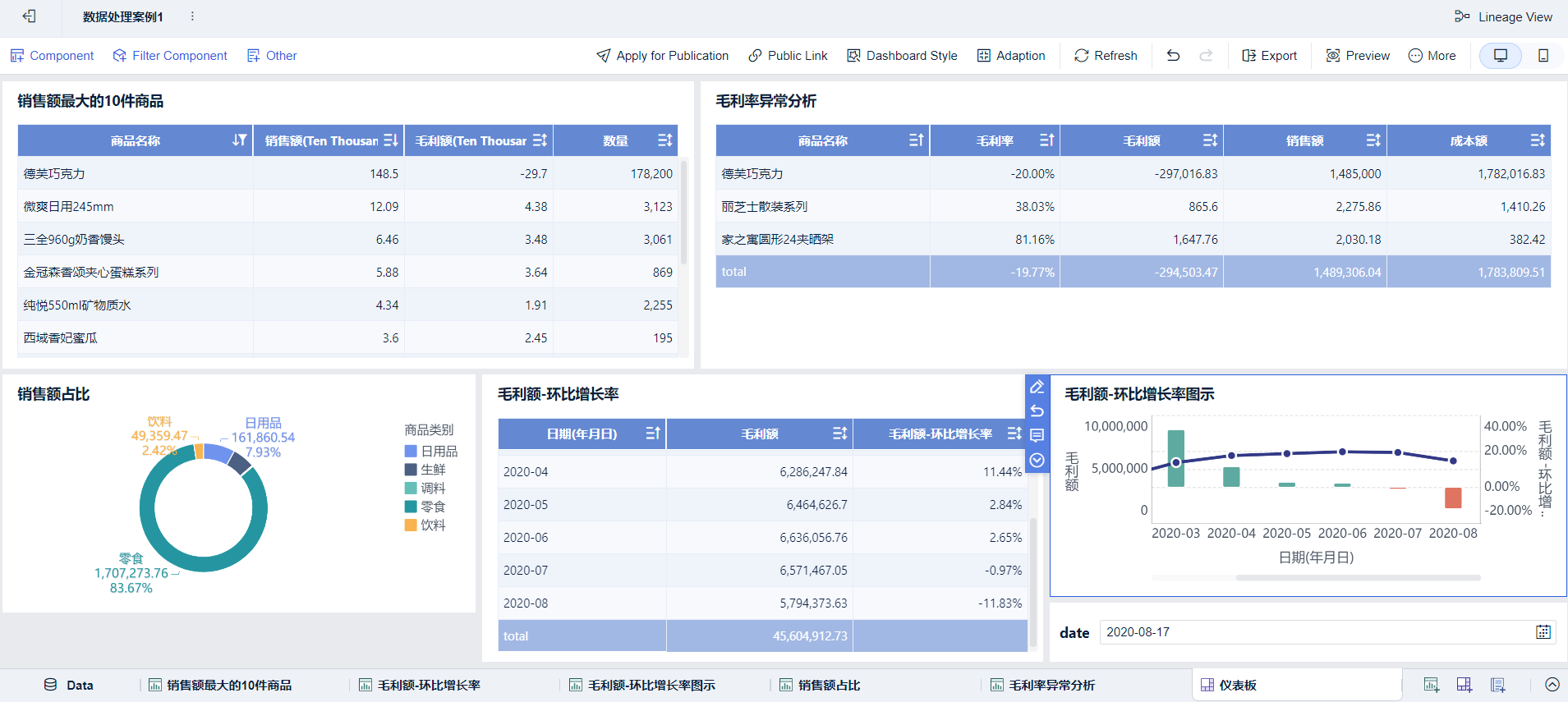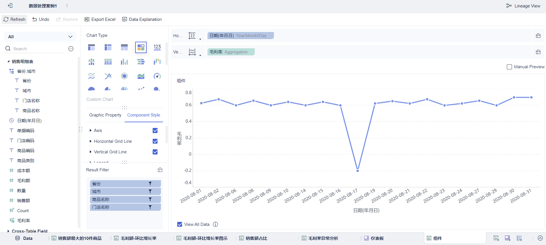 再对仪表盘组件进行重新编辑和分析时,我们观察到一个显著的现象:8月17日,即中国的七夕节当天,德芙巧克力的销售额出现异常波动,销售额显著增加但毛利额异常低下。鉴于七夕节在现代被广泛认为是情侣之间表达爱意的节日,巧克力作为爱情的象征,在这一天的销售激增与节日背景高度相关。因此,在这种情况下,运营团队需要深入了解公司是否实施了特定的营销活动,例如会员优惠、积分折扣等。