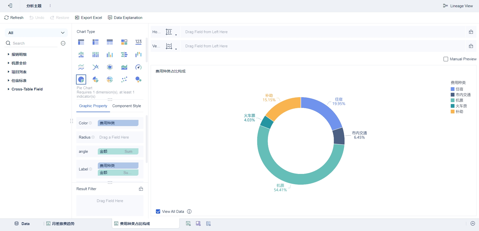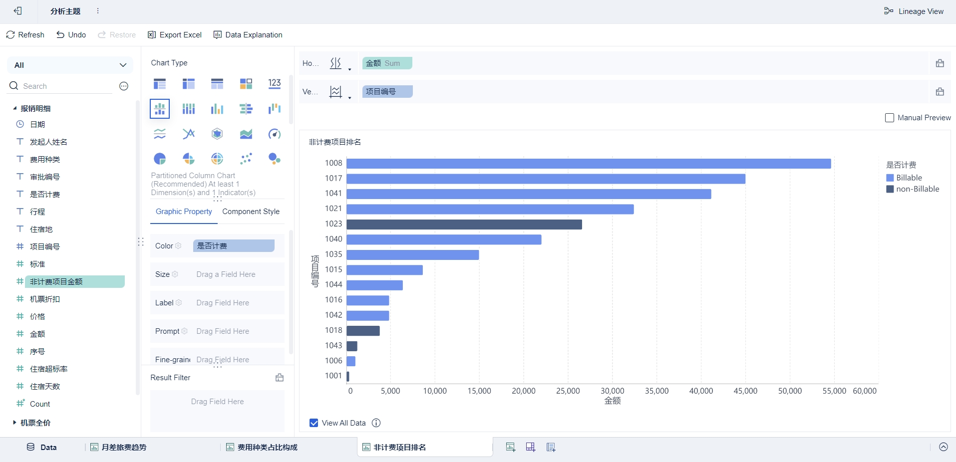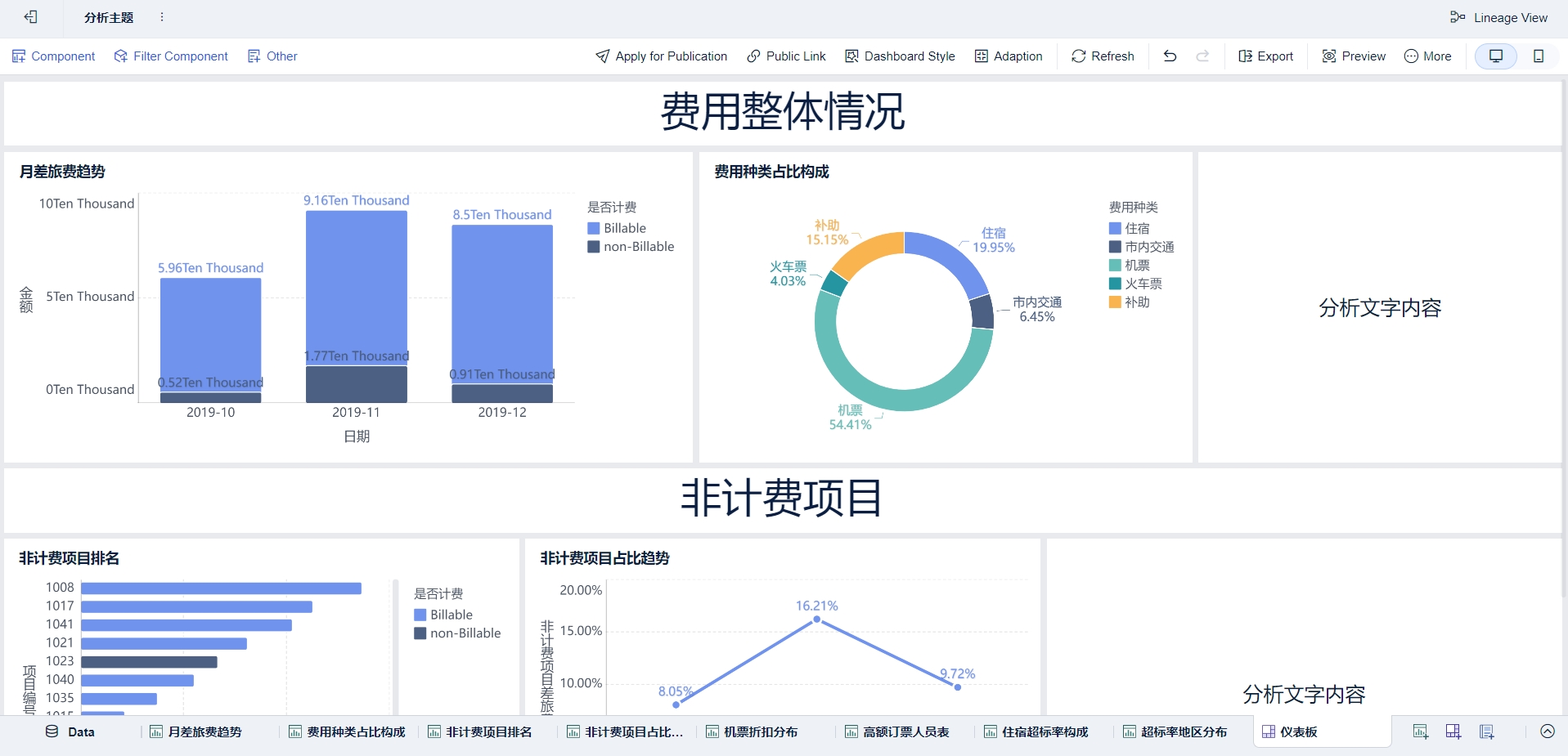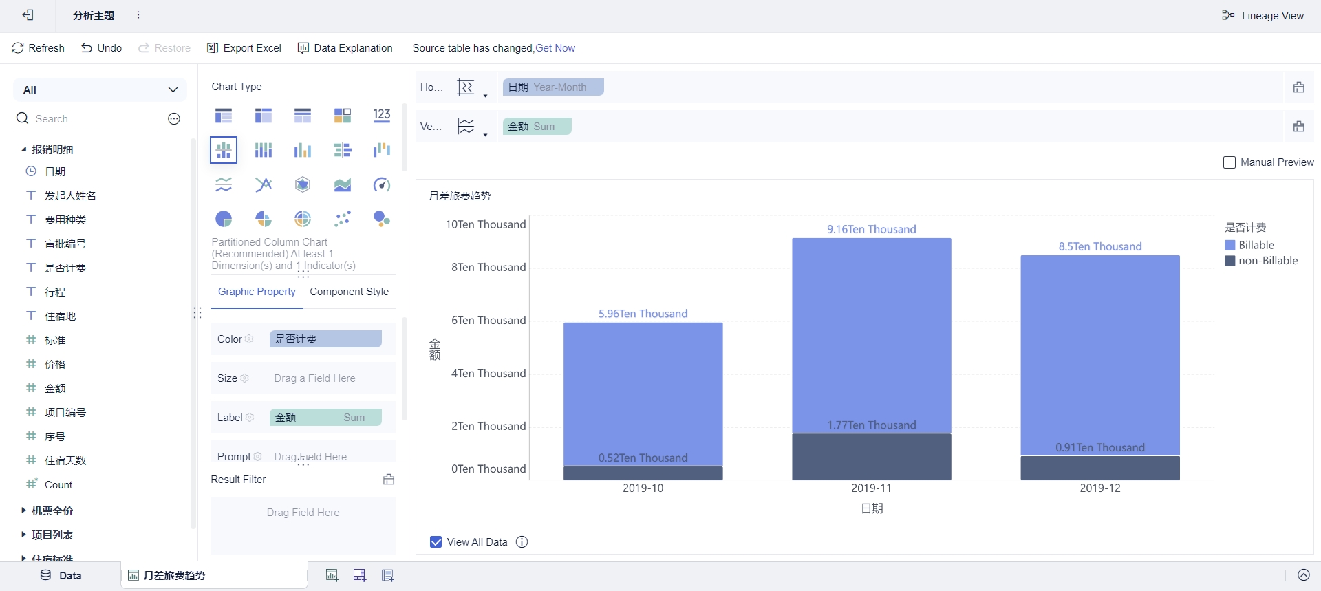 添加组件,作为月度差旅趋势分析,同时添加是否计费帮助进行占比分析