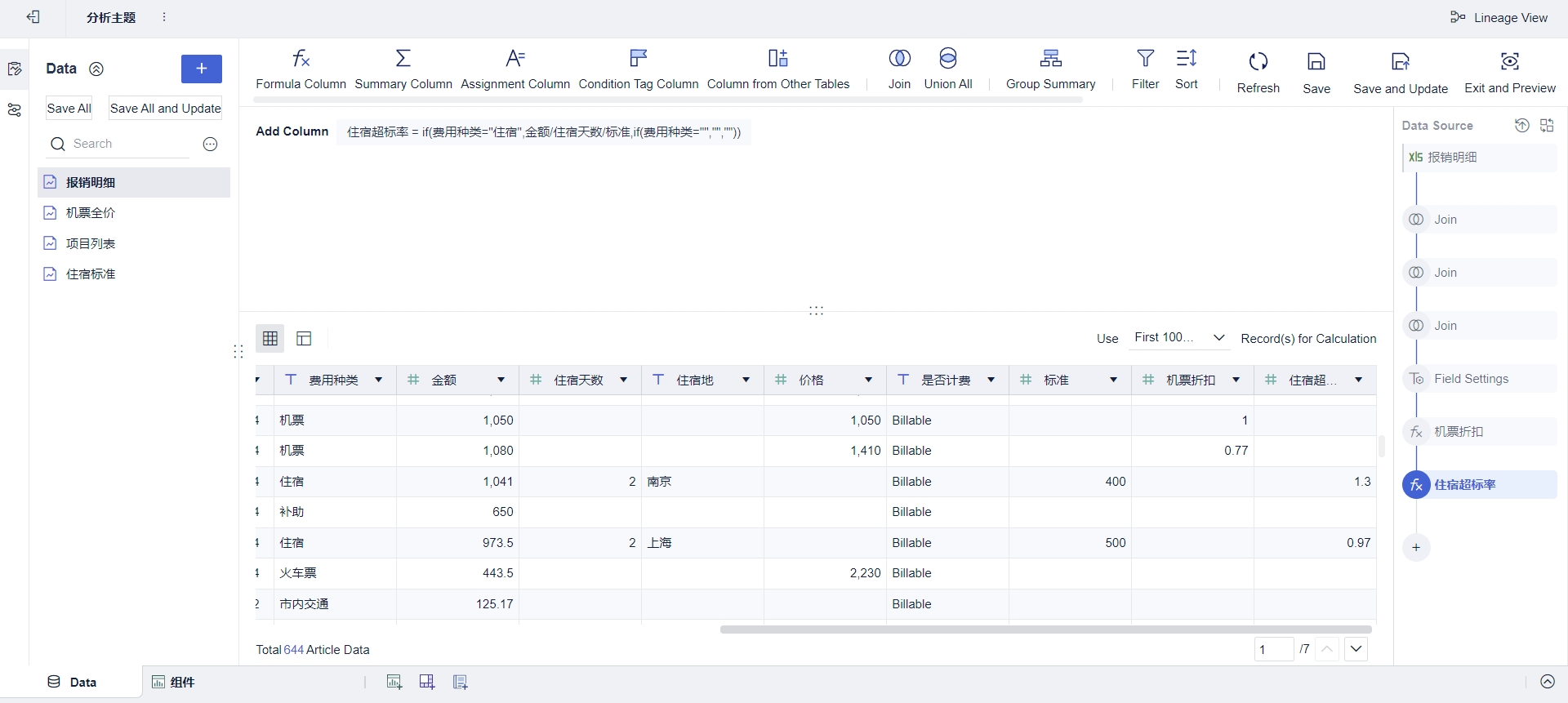 住宿存在预算标准限制,因此需要计算住宿超标率,新增公式列住宿超标率