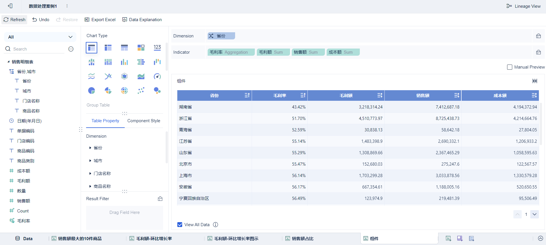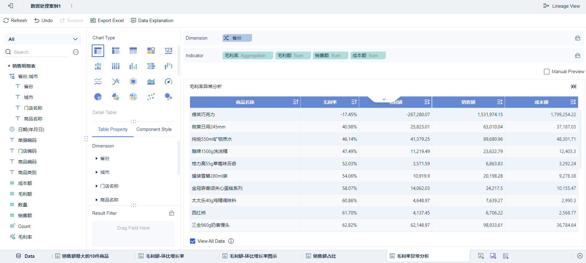 将拖动维度钻取目录省份,城市,拖动指标毛利率,毛利额,销售额,成本额,升序毛利率查看省份最低的是哪一个