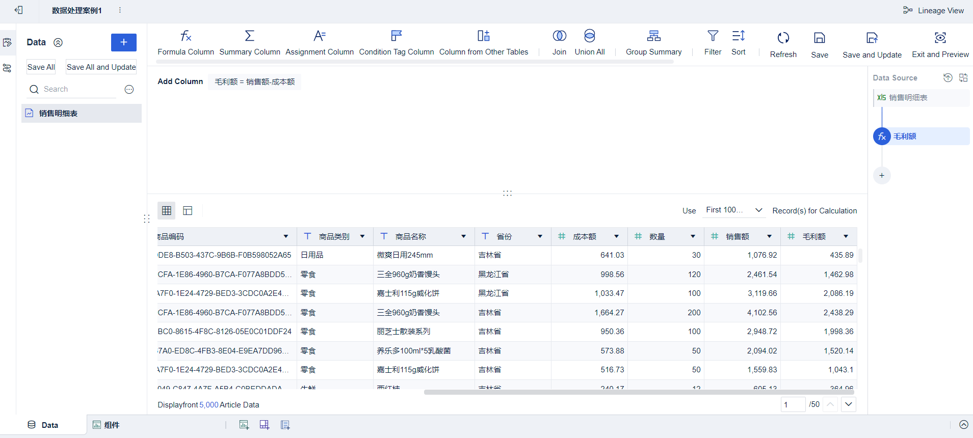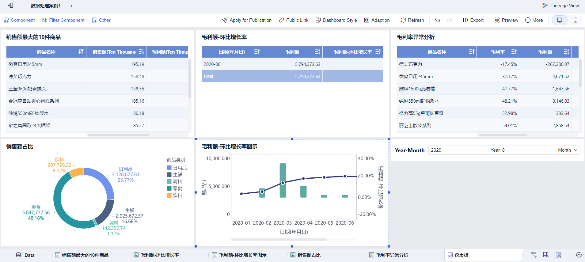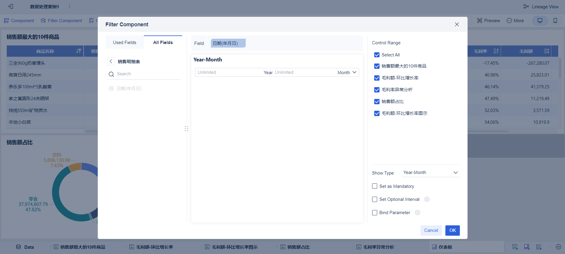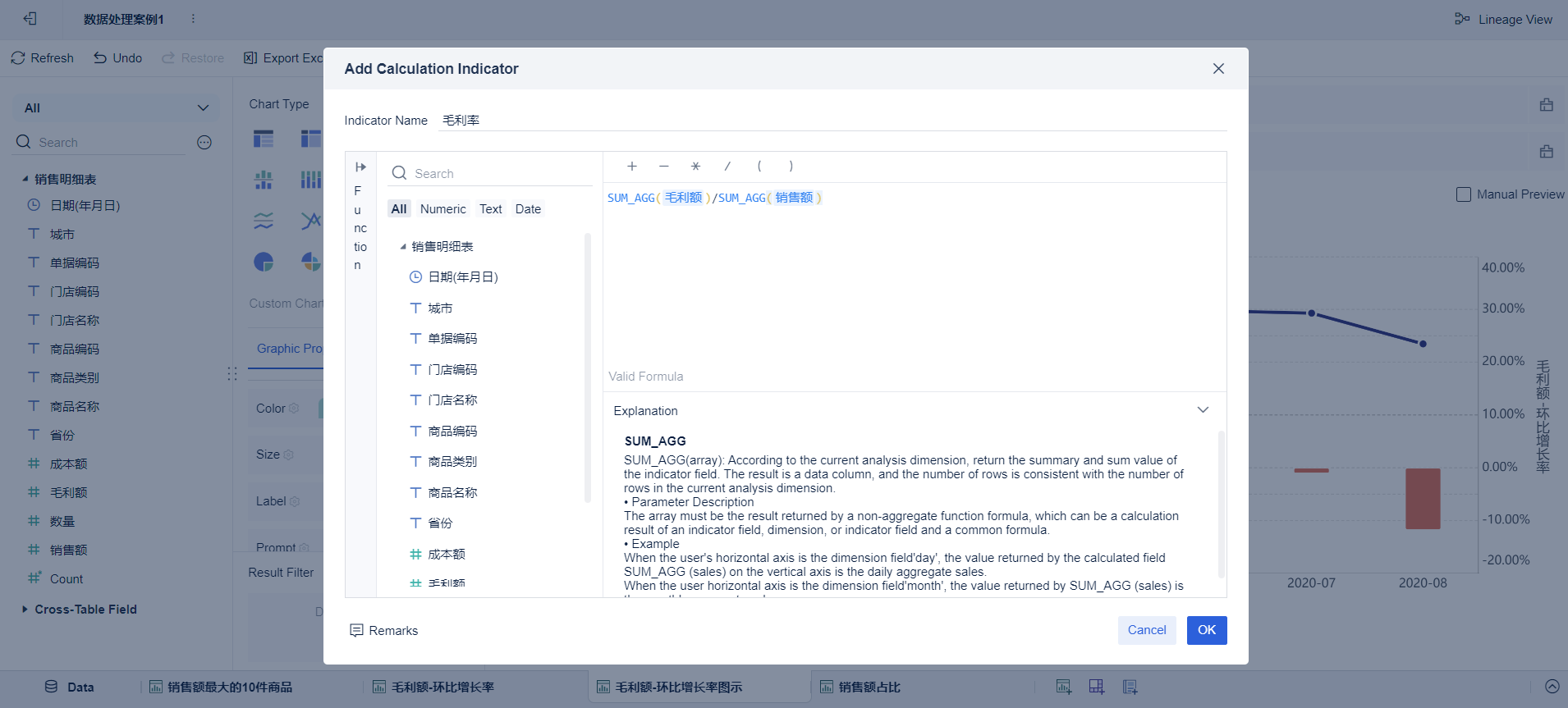 - FineBI中毛利率计算:SUM_agg(毛利额) / SUM_agg(销售额)