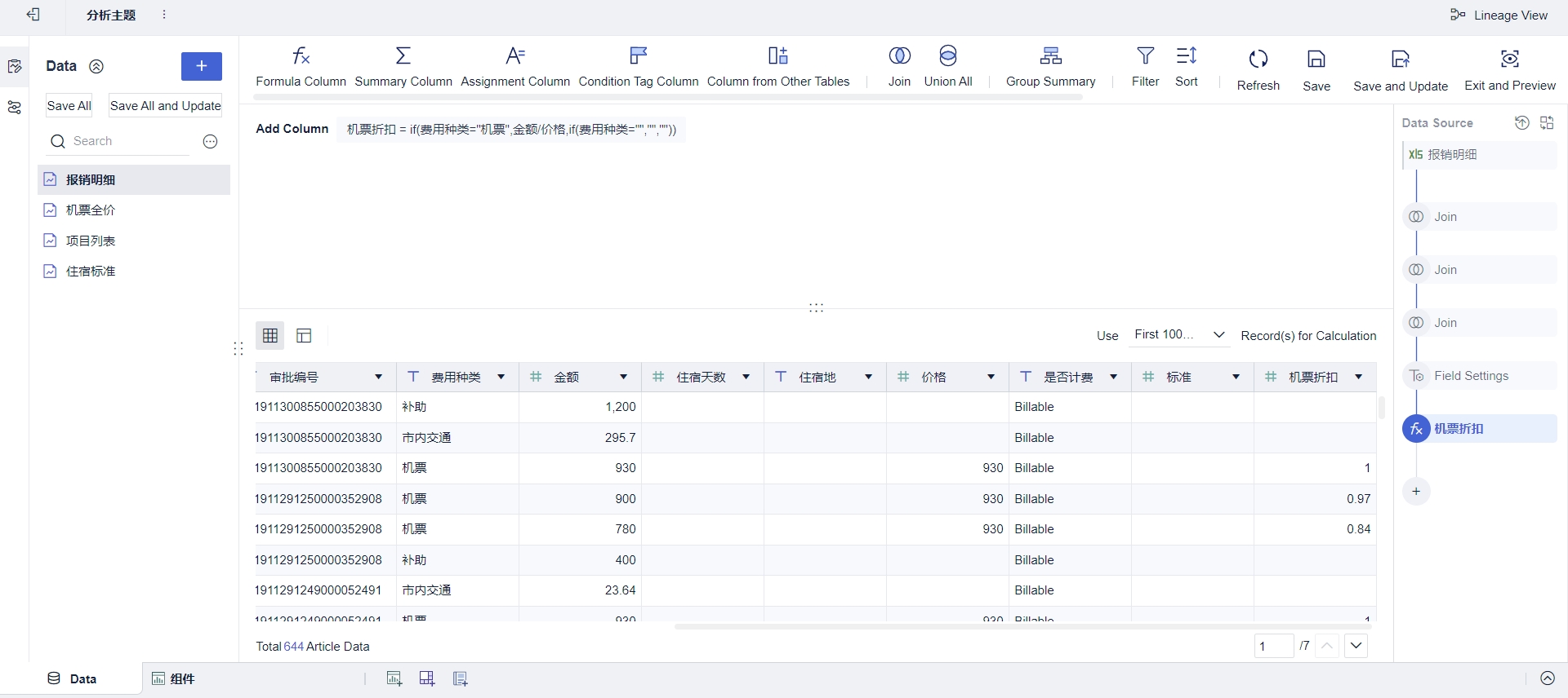 由于机票价格存在季节性,因此需要计算机票折扣,则新增公式列机票折扣