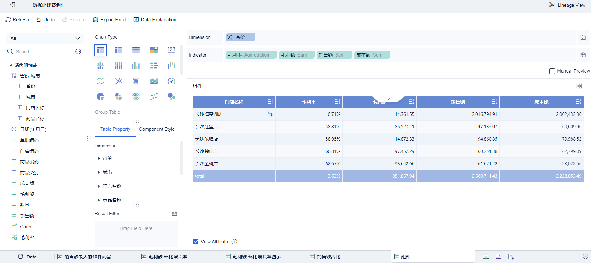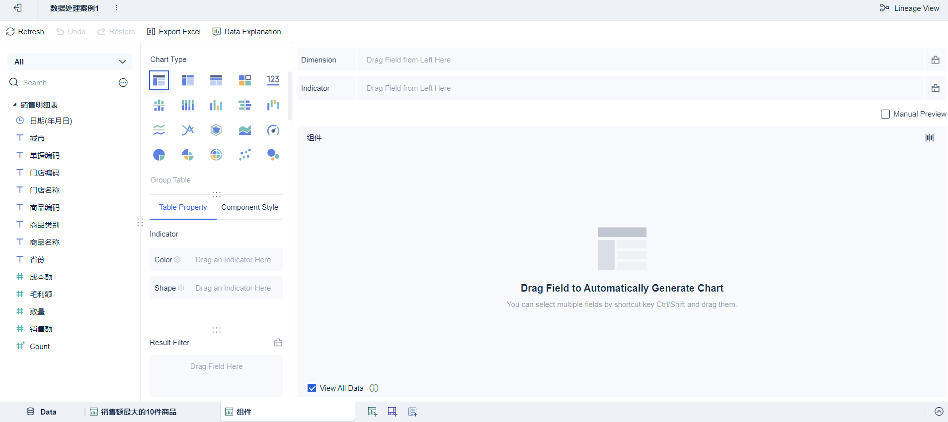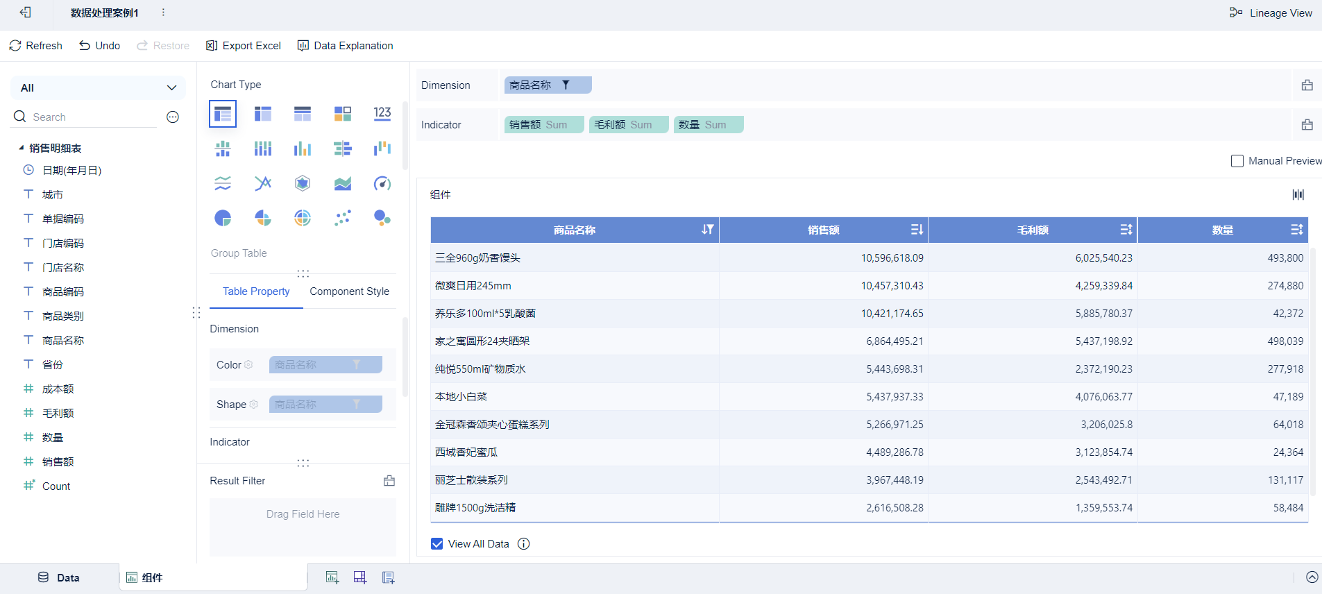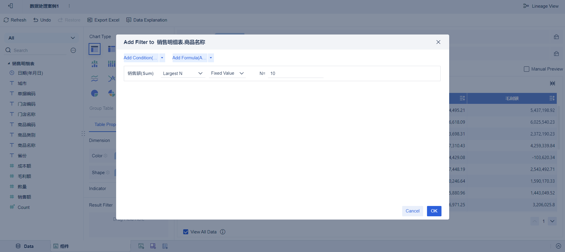 拖动需要的表头维度商品名称,指标数量,销售额和毛利额到分组表,过滤维度数量最大为10