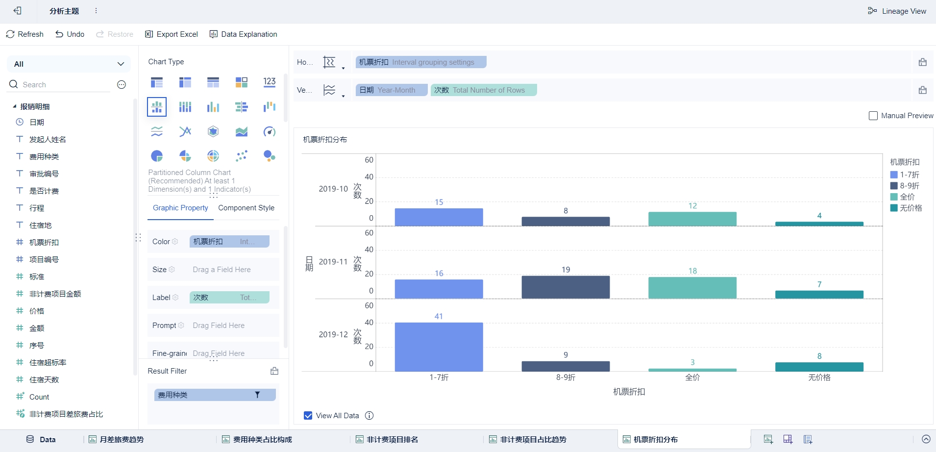 转化机票折扣为维度,过滤费用种类为机票。设置区间分组为三组,1-7折,8-9折和全价,创建组件分区柱形图,根据日期与次数进行分类