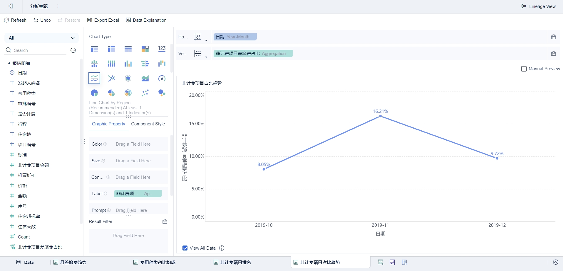 过滤金额为非计费项目命名为非计费项目金额,创建新的计算规则为SUM_AGG(${非计费项目金额})/SUM_AGG(${金额})非计费项目差旅费占比,添加进组件分区折线图,得出占比变化趋势