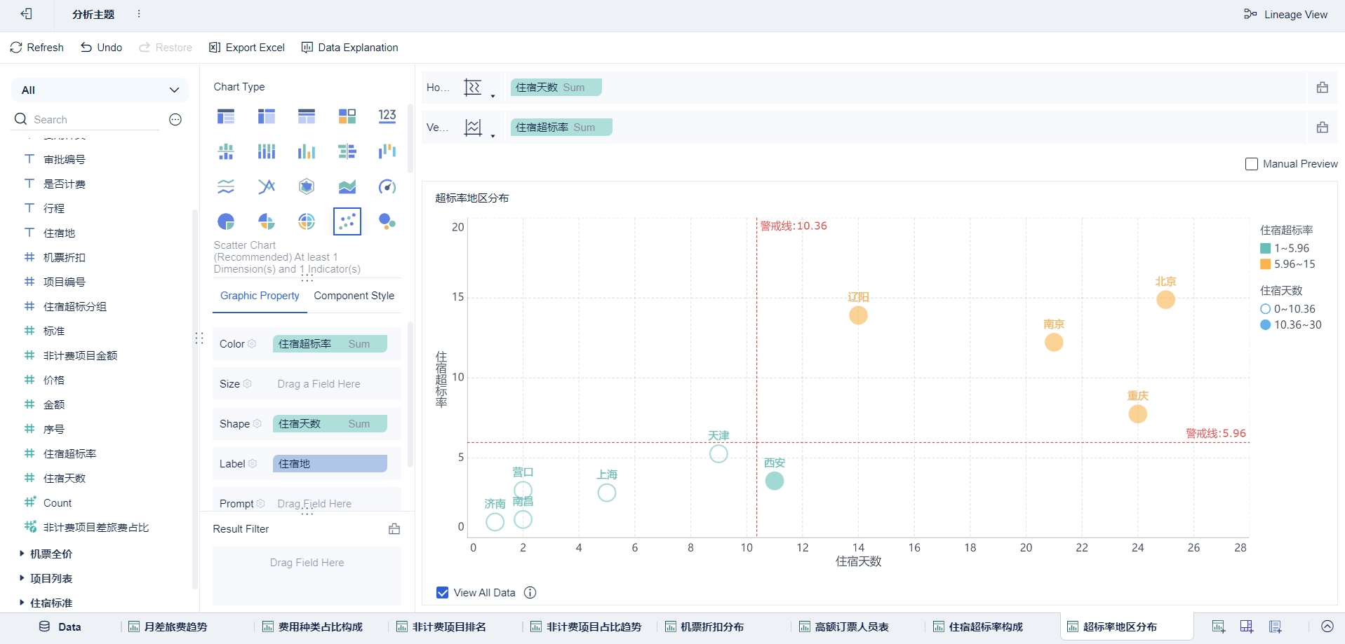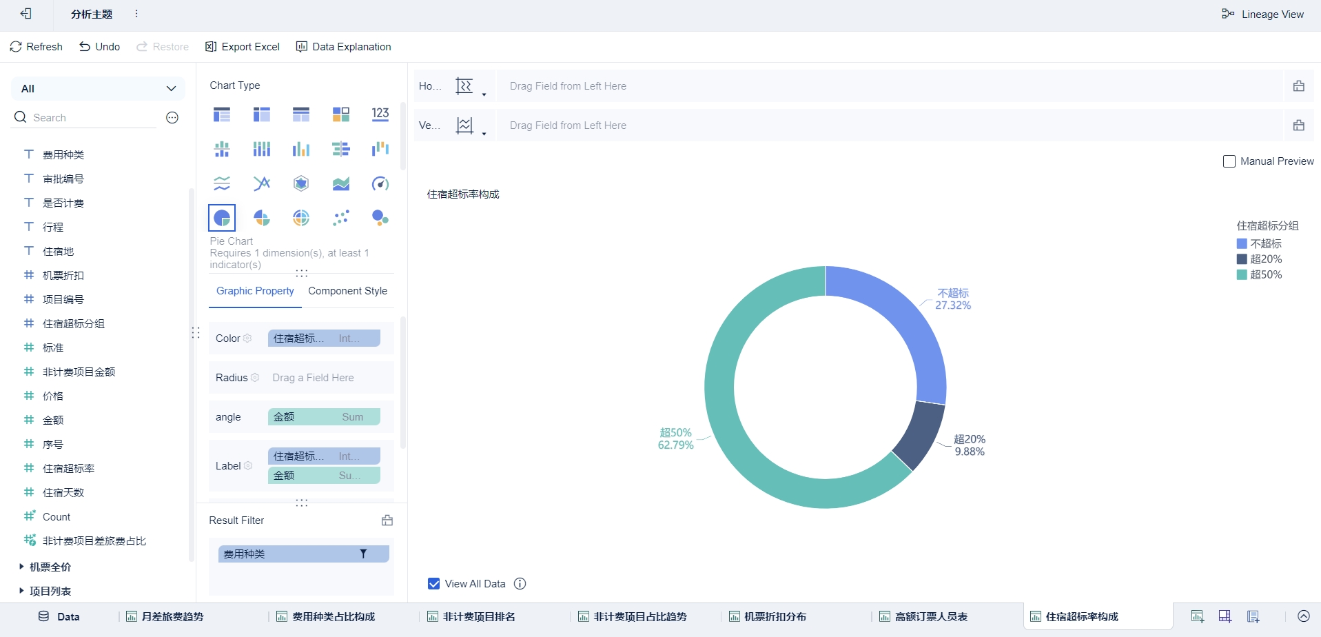 复制住宿超标率重命名为住宿超标分组并转化为维度,设置区间分组三组为不超标,超20%和超50%,设置过滤费用种类为住宿,添加组件饼图