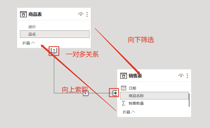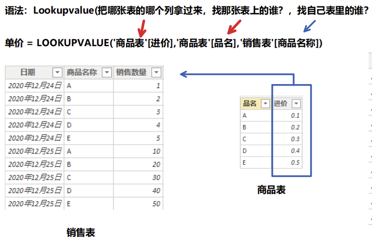 单价 = LOOKUPVALUE('商品表'[进价],'商品表'[品名],'销售表'[商品名称])