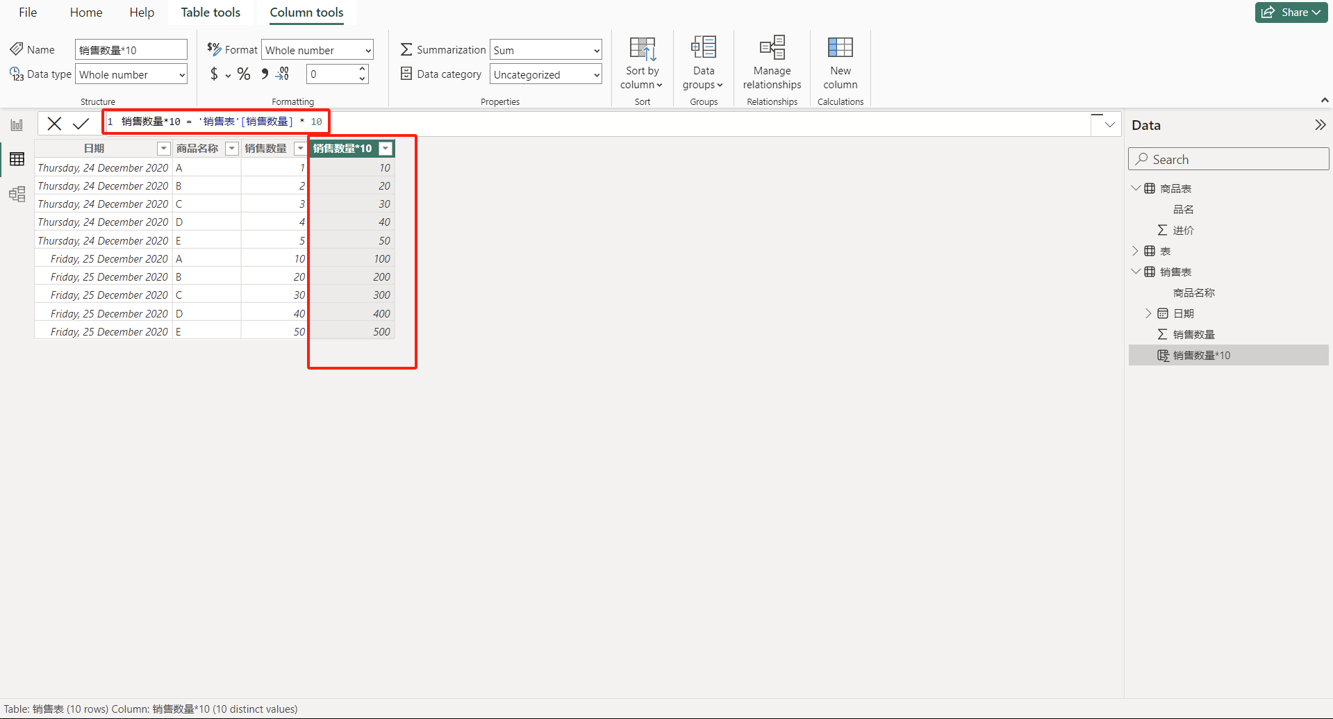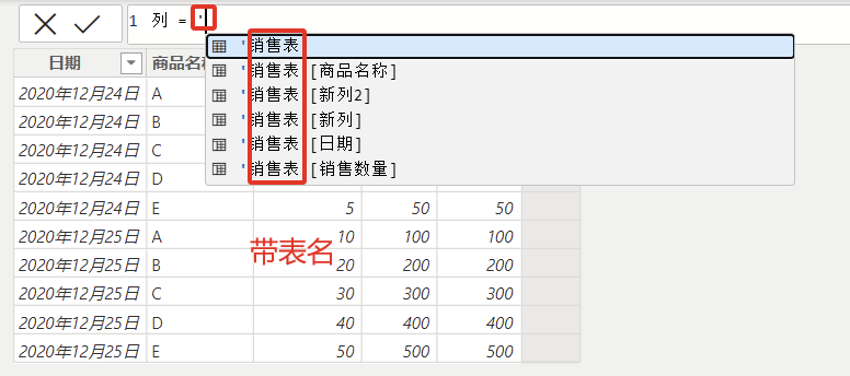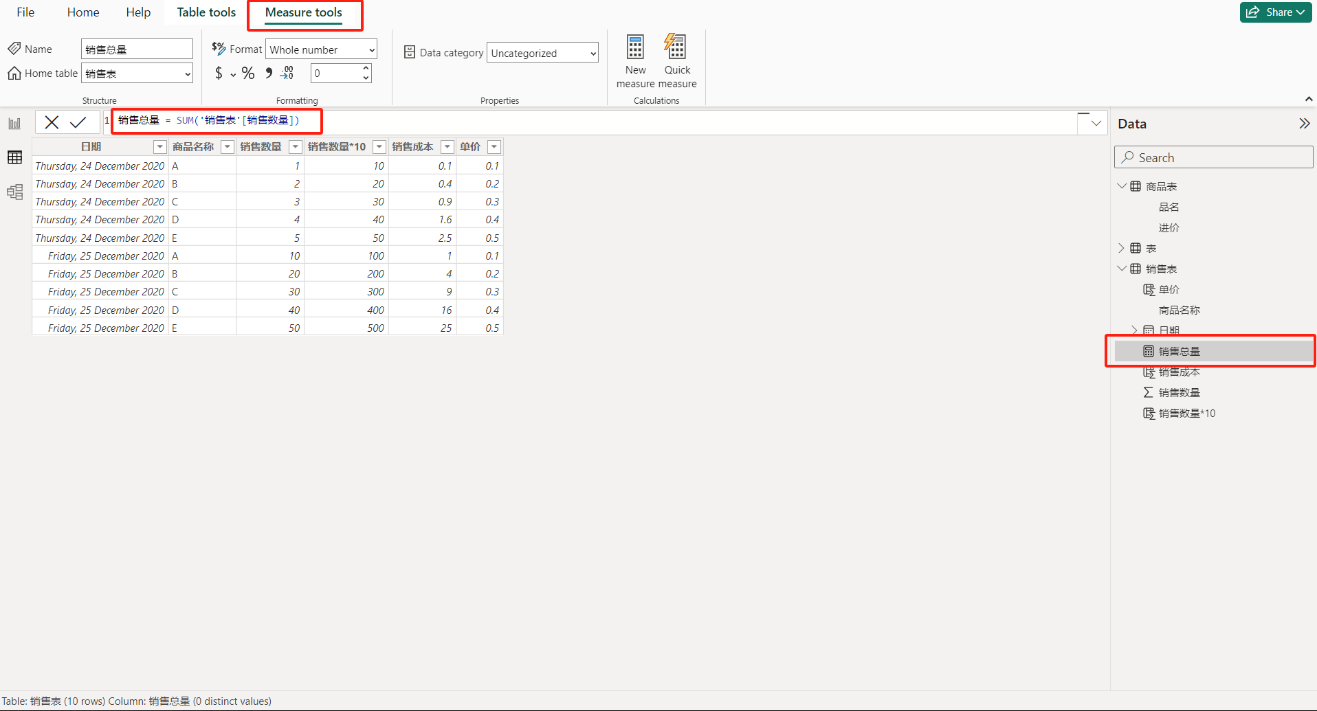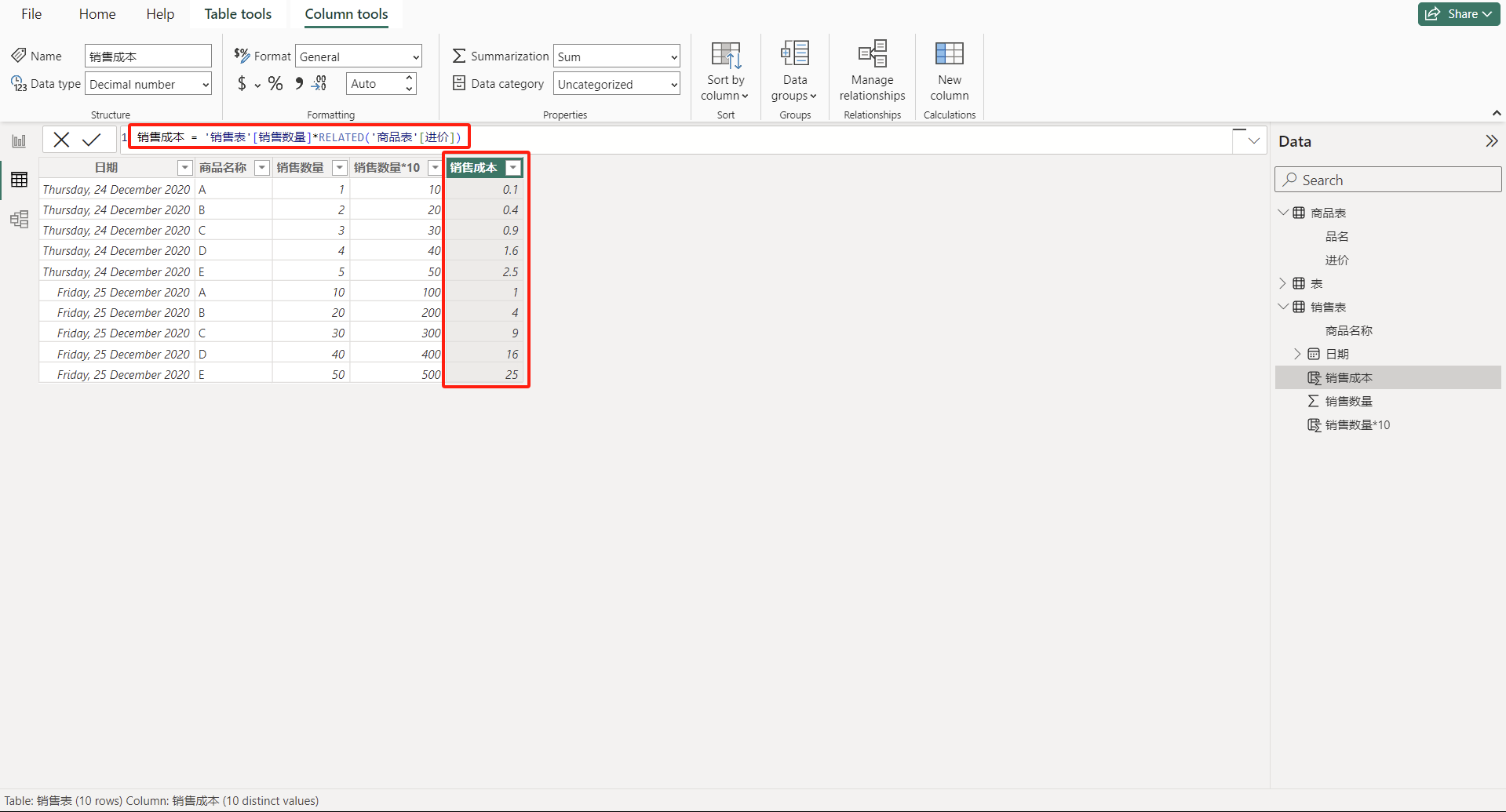 销售成本 = '例1'[销售数量]*'例1'[单价]