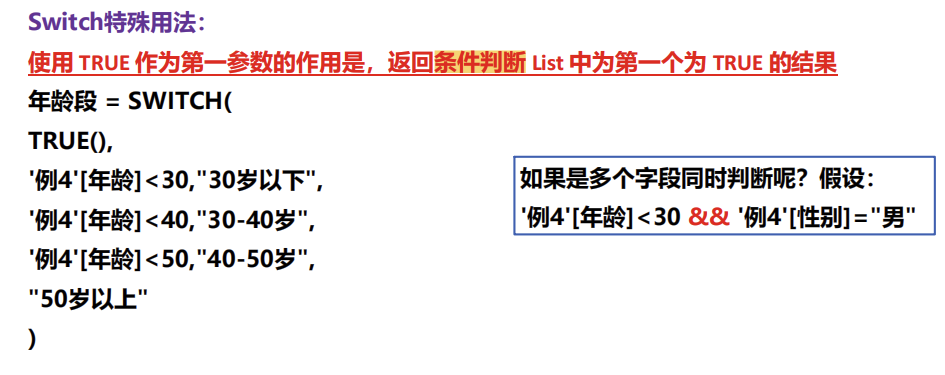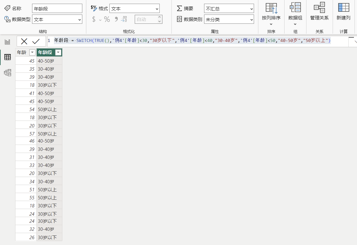 年龄段 = SWITCH(TRUE(),'例4'[年龄]<30,"30岁以下",'例4'[年龄]<40,"30-40岁",'例4'[年龄]<50,"40-50岁","50岁以上")