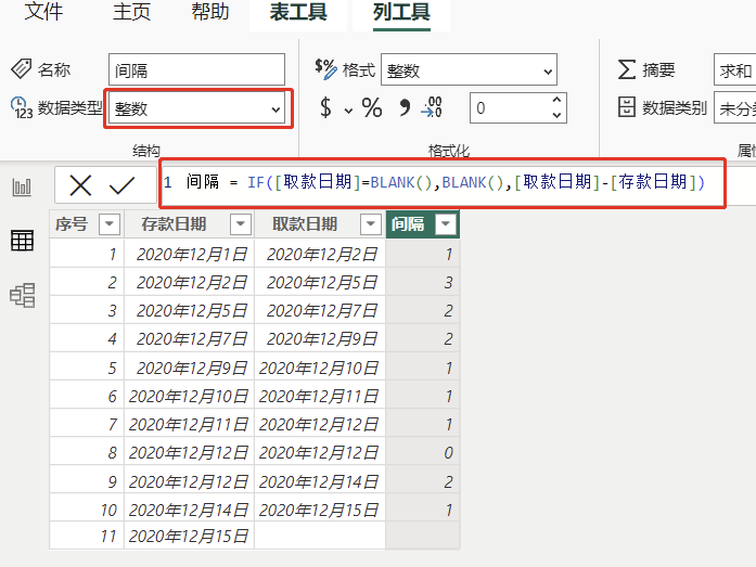 间隔 = IF([取款日期]=BLANK(),BLANK(),[取款日期]-[存款日期])