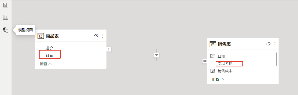 两个表之间的操作,先进行表与表之间的关联,在模型视图进行,拖动品名到销售表即可