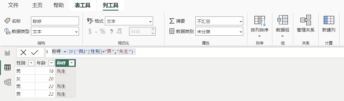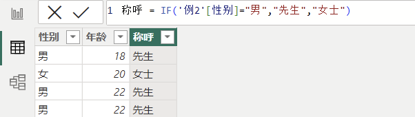 称呼 = IF('Sheet1'[性别] ="男","先生","女生")