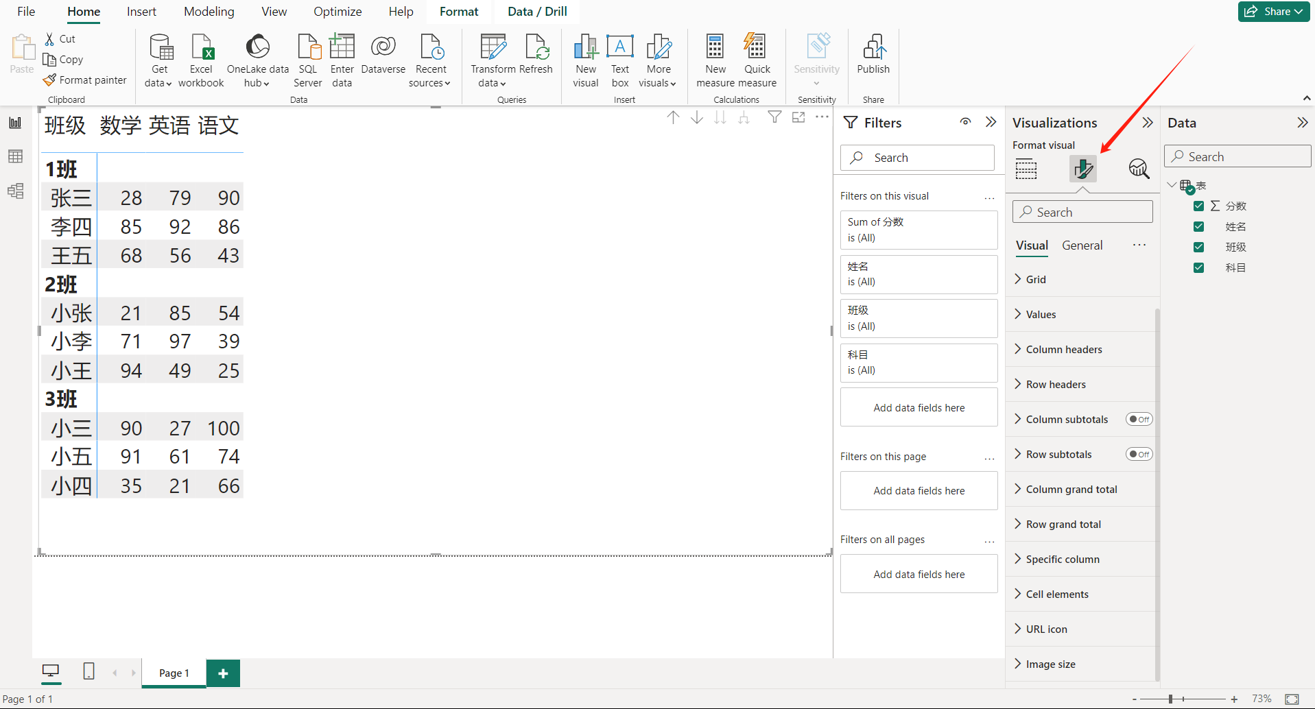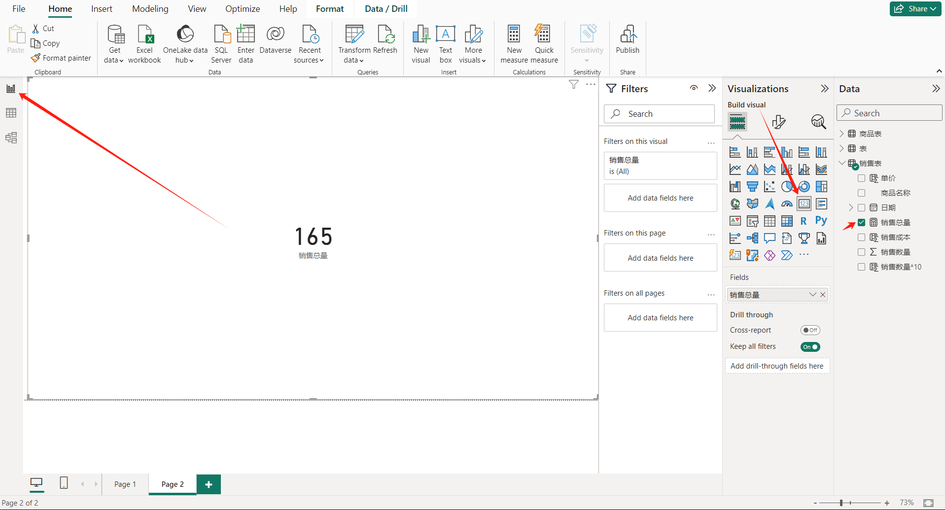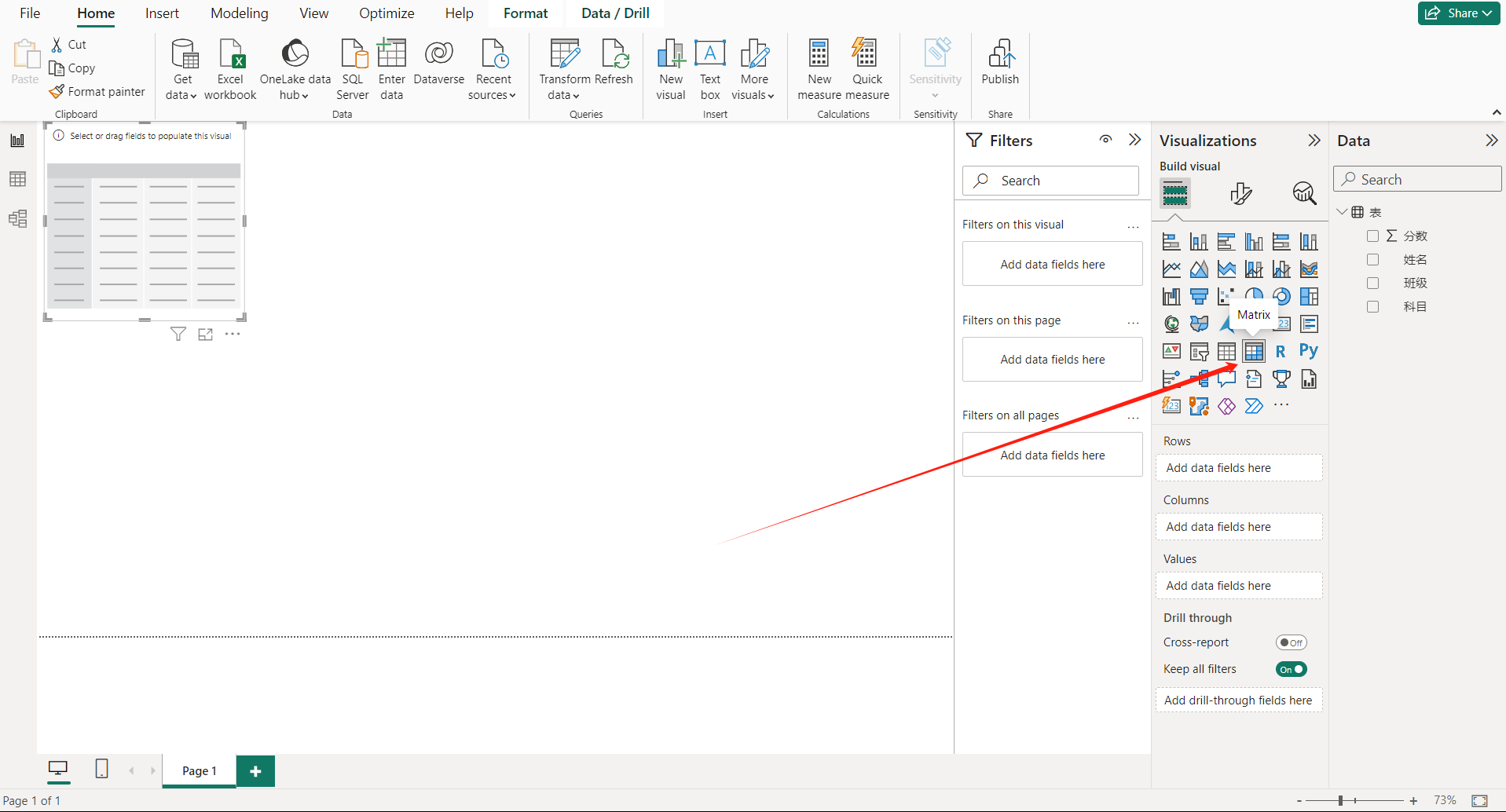 - 数据:查看与报表关联的数据模型中使用的表、度量值和其他数据,并转换数据以便在报表的模型中充分利用。