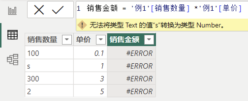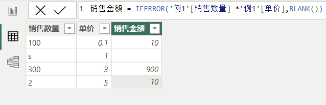 销售金额 = IFERROR('例1'[销售数量] *'例1'[单价],BLANK())