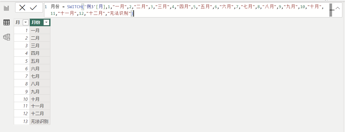 月份 = SWITCH('例3'[月],1,"一月",2,"二月",3,"三月",4,"四月",5,"五月",6,"六月",7,"七月",8,"八月",9,"九月",10,"十月",11,"十一月",12,"十二月","无法识别")