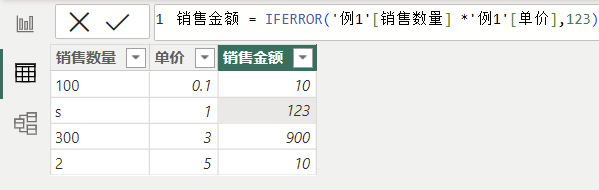 销售金额 = IFERROR('例1'[销售数量] *'例1'[单价],123)