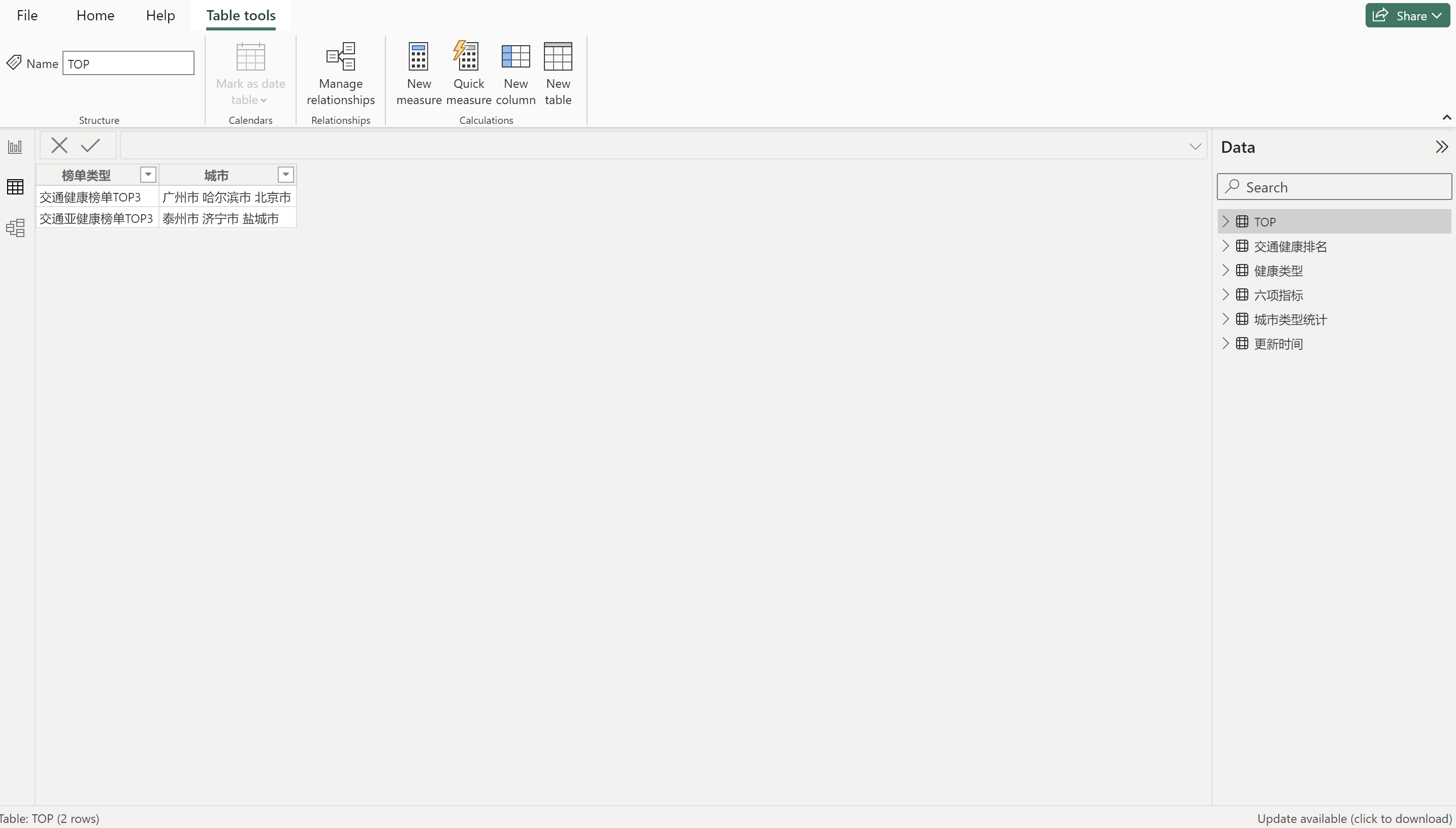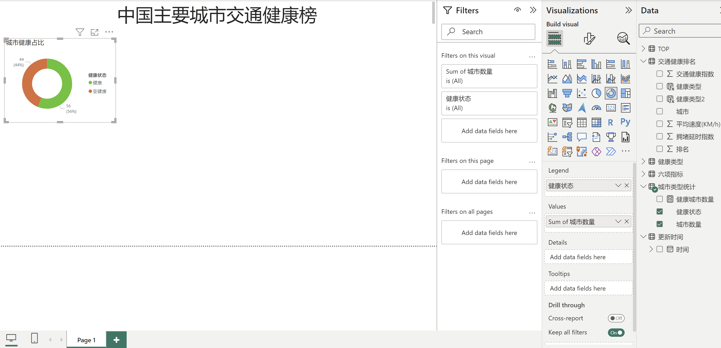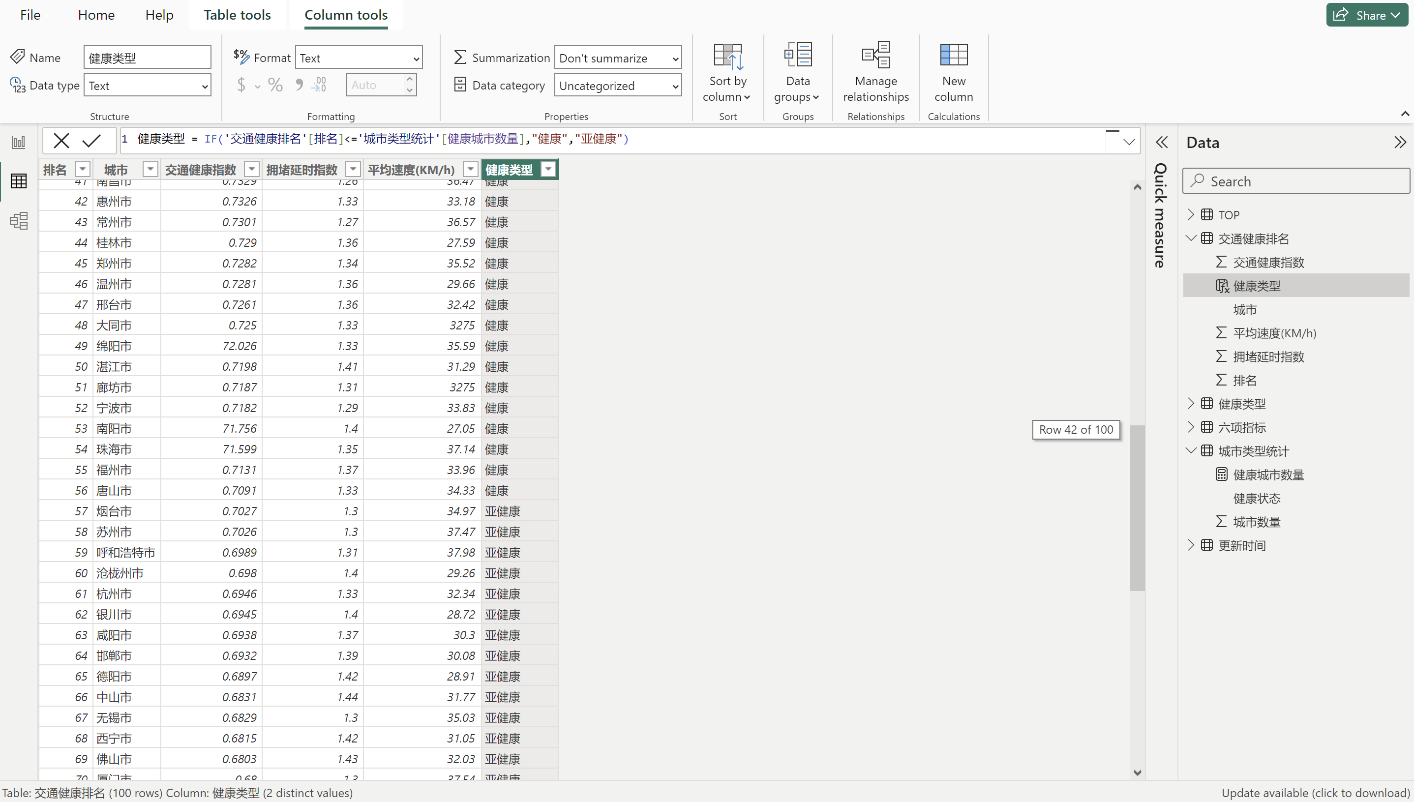健康类型 = IF('交通健康排名'[排名]<='城市类型统计'[健康城市数量],"健康","亚健康") 判断健康排名小于等于健康城市数量,健康城市引用我们刚刚建设的度量值,满足就是健康,否则就是亚健康。
