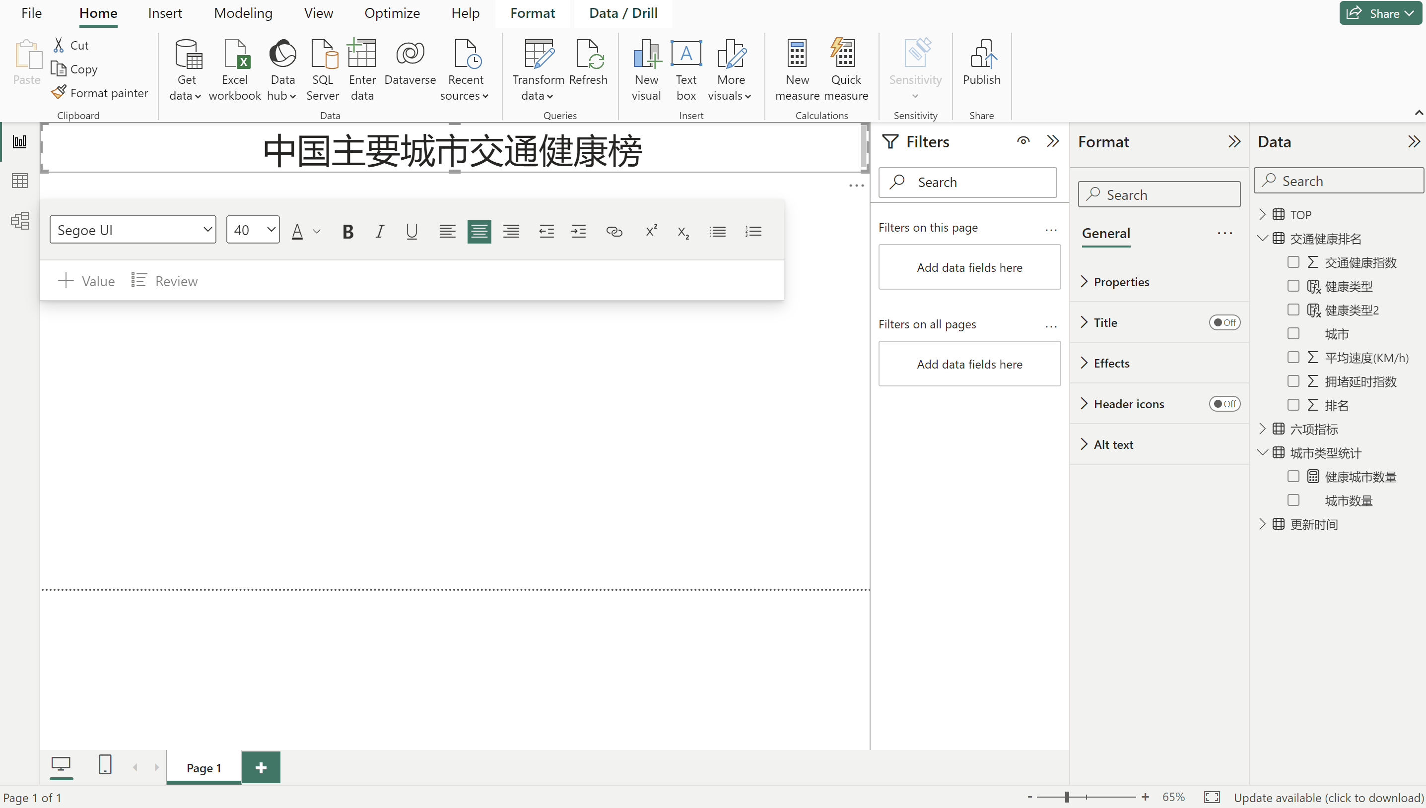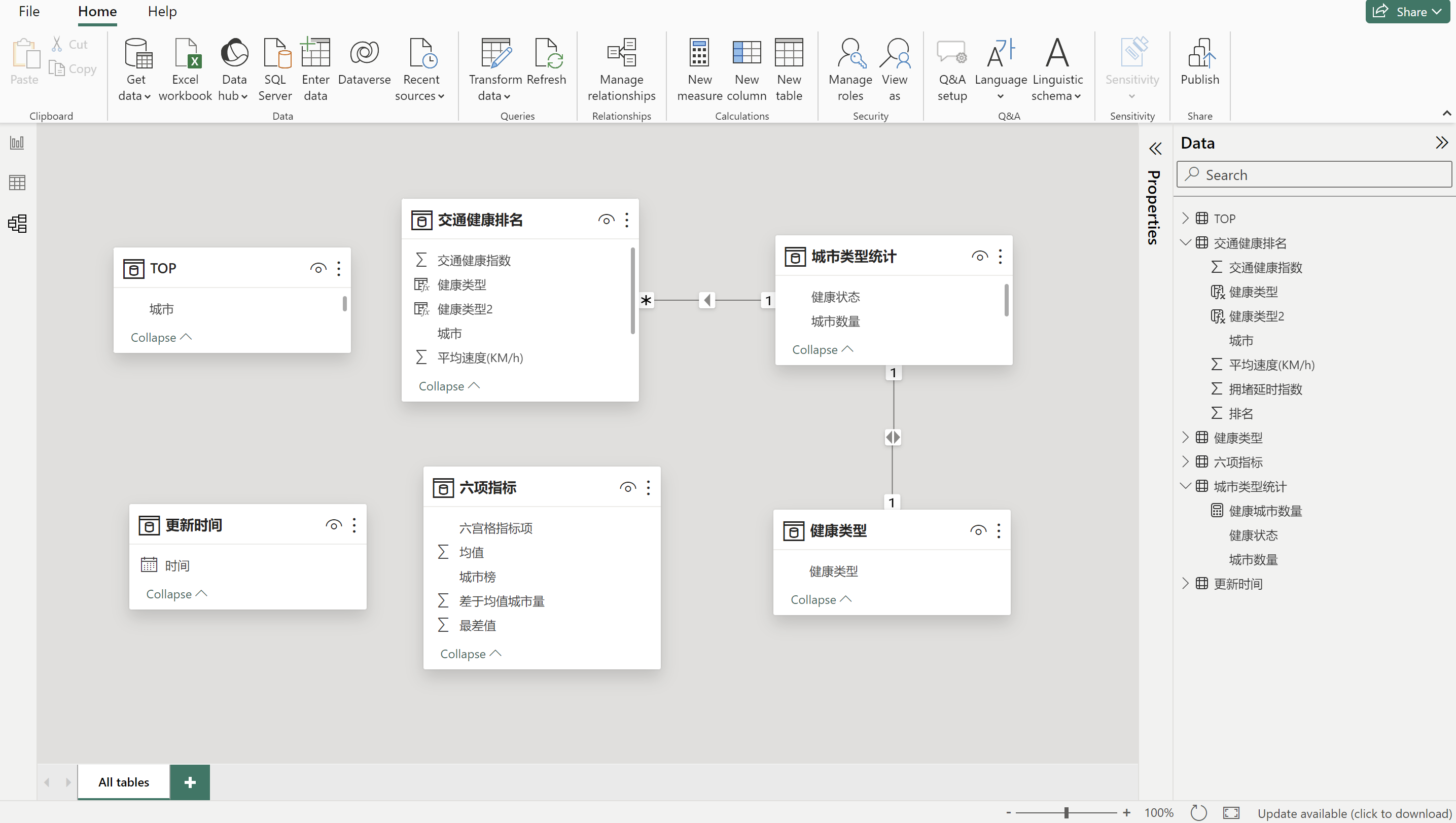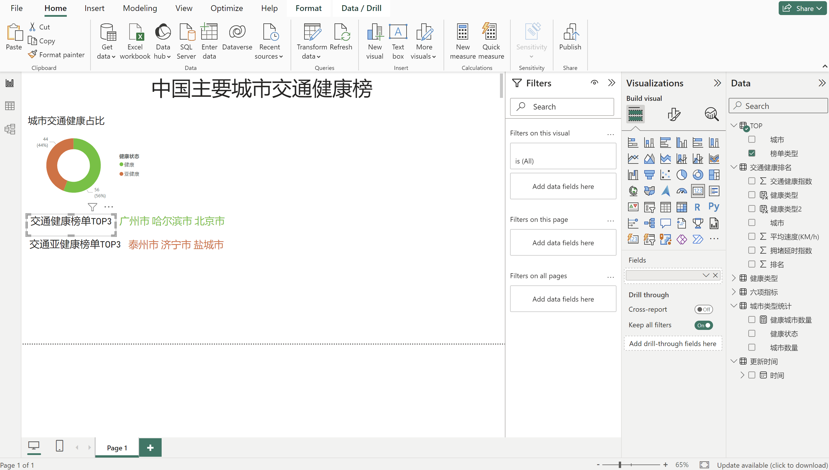 健康类型 = IF('交通健康排名'[排名]<='城市类型统计'[健康城市数量],"健康","亚健康") 判断健康排名小于等于健康城市数量,健康城市引用我们刚刚建设的度量值,满足就是健康,否则就是亚健康。